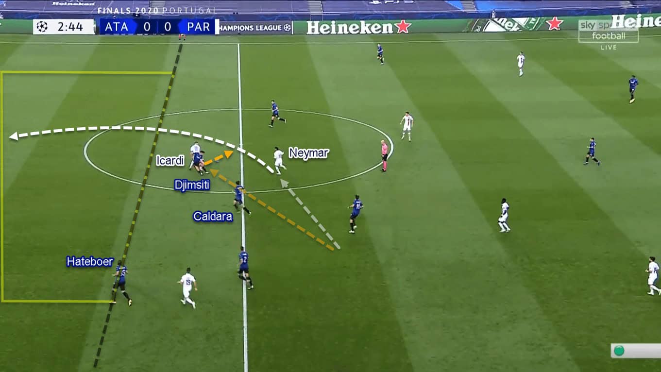 Then, the receiving attacker would lay the ball off to one of the deeper players. This was mostly either to Herrera or Idrissa Gana Gueye. However, Neymar could also receive the lay-off between the lines. That mostly happened when either Sarabia or Icardi won the physical ball for the Brazilian.