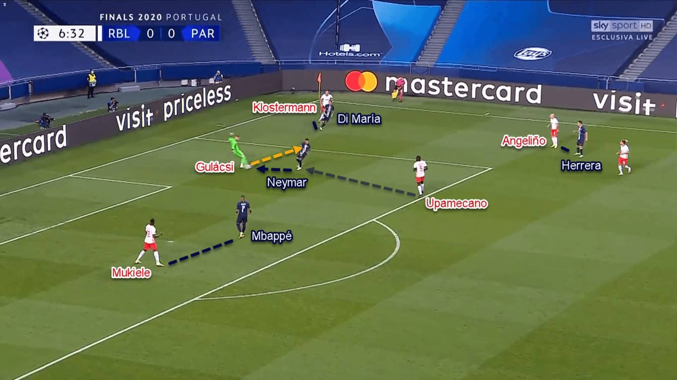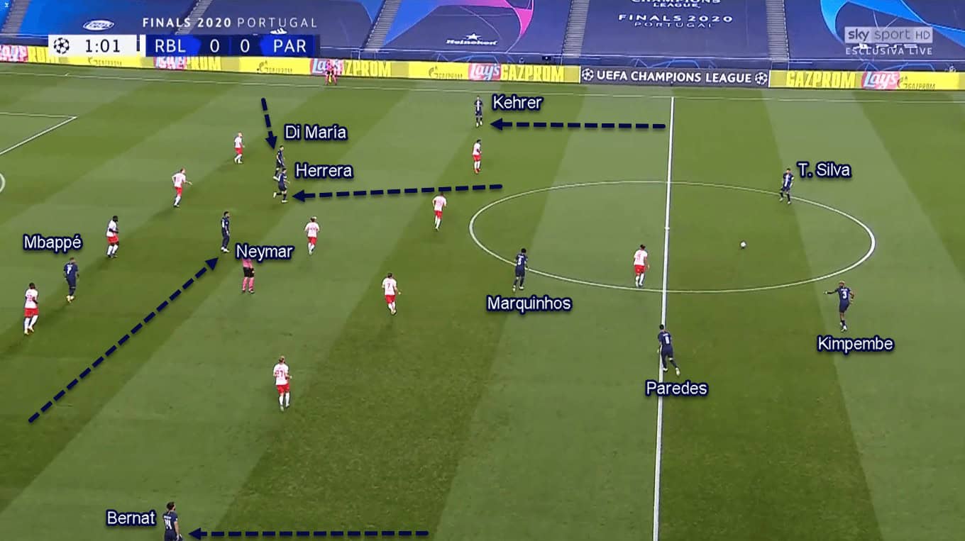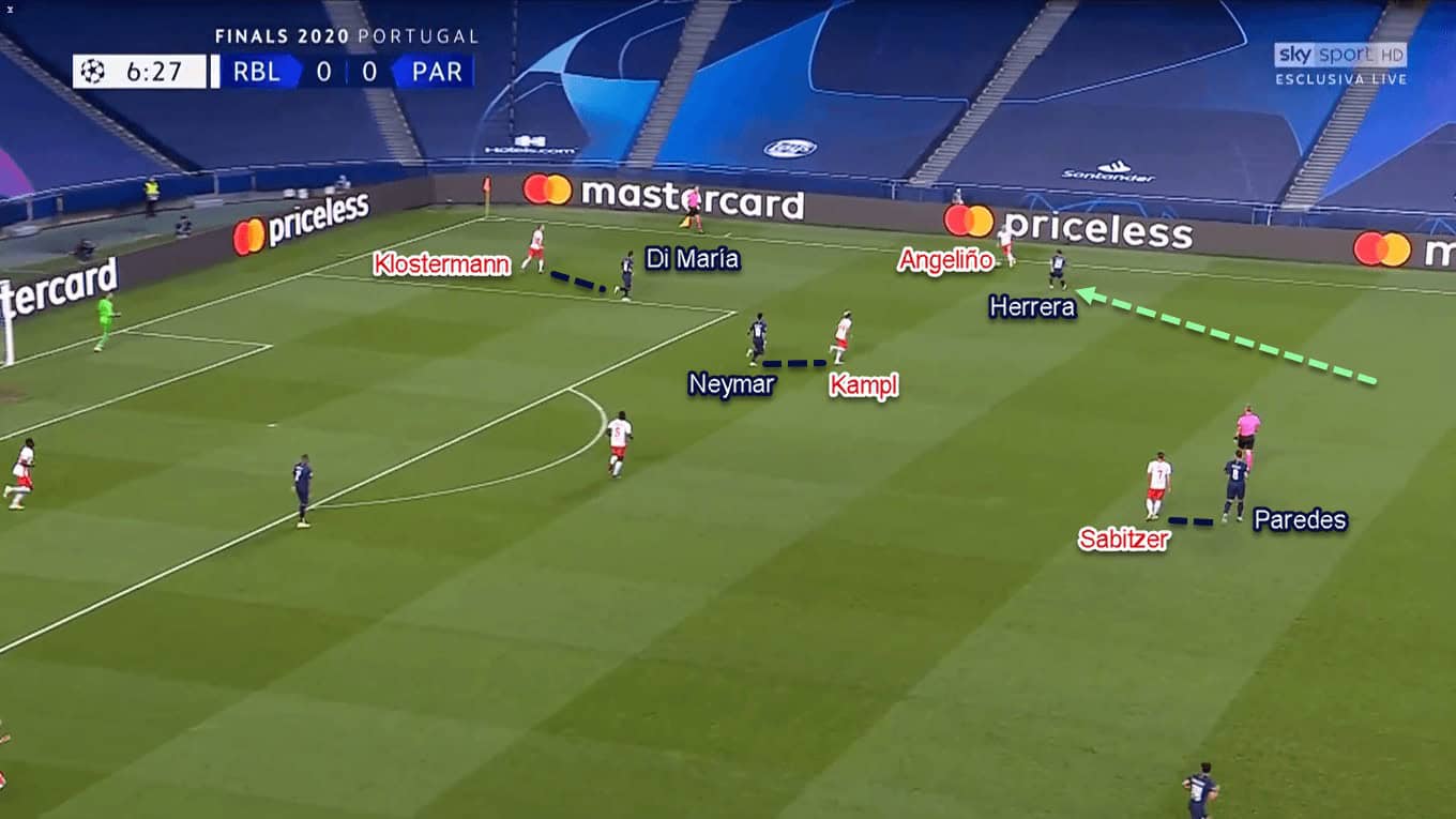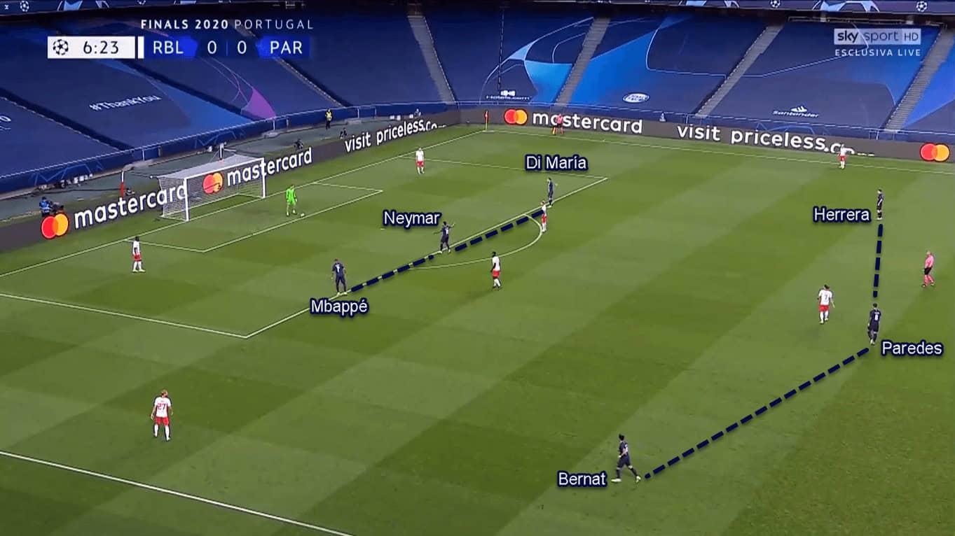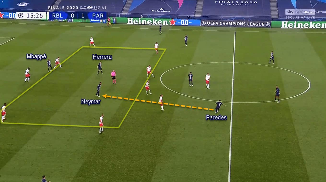 The objective behind this was mainly to utilise Paredes’ passing ability. By putting himself deeper than Herrera, Paredes could provide line-breaking passes to Neymar, Di María, or even Herrera in behind Leipzig’s midfield line. After that, the receiver would try to find one of his attacking comrades in behind the defenders.