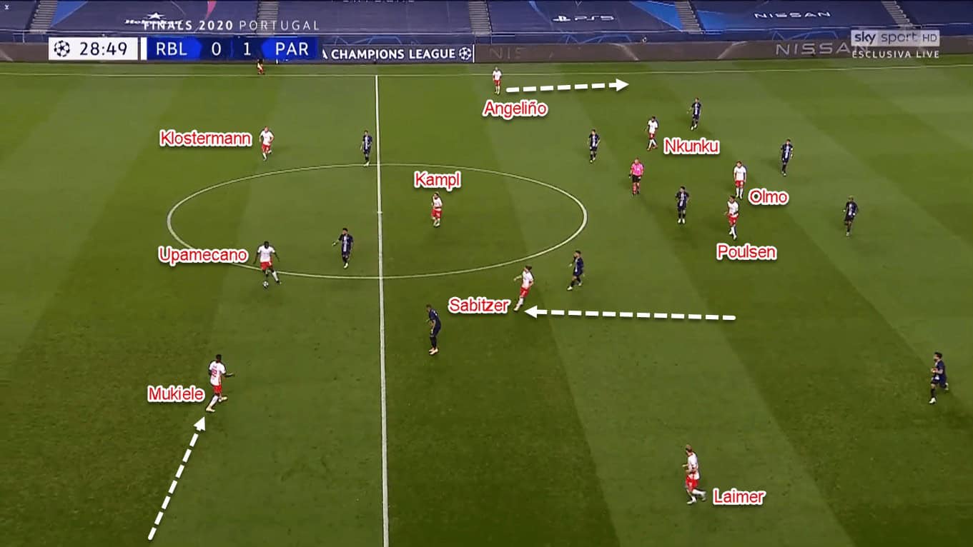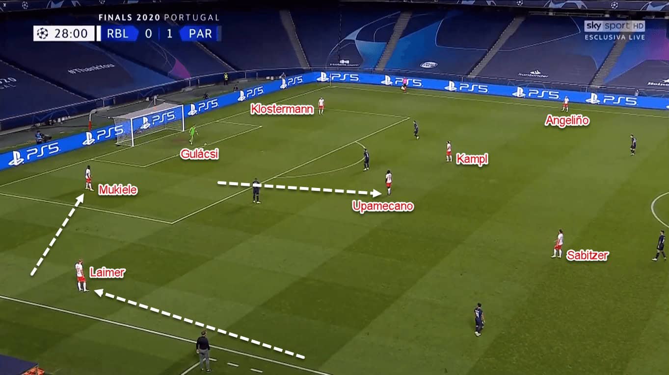 Upamecano’s position then was filled by Nordi Mukiele. The right-back dropped from his designated area and tucked himself next to Gulácsi. The objective was to offer himself as a short right-side option for the goalkeeper. Then, Mukiele’s position was filled by the dropping Laimer. By doing so Laimer would play in parallel with Upamecano, Kampl, and Angeliño in Leipzig’s second attacking line.