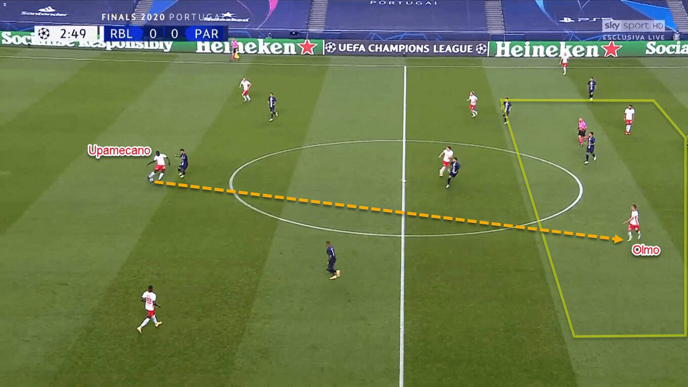 When they had the ball, Leipzig would try to find one attacker in between the lines. To be more specific, the distributing role was given to one of the centre-backs – mostly Upamecano. Up front, Olmo or another attacker would try to receive the line-breaking pass in the half-space.