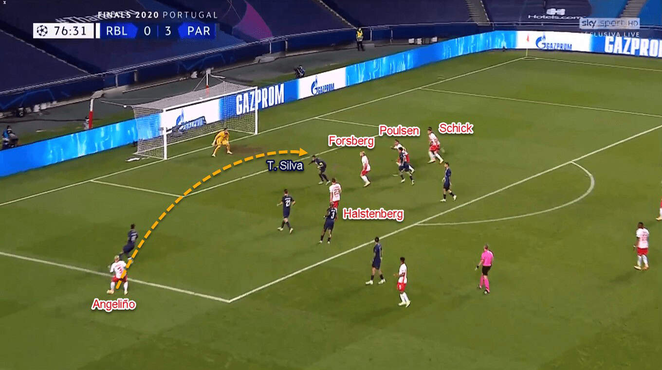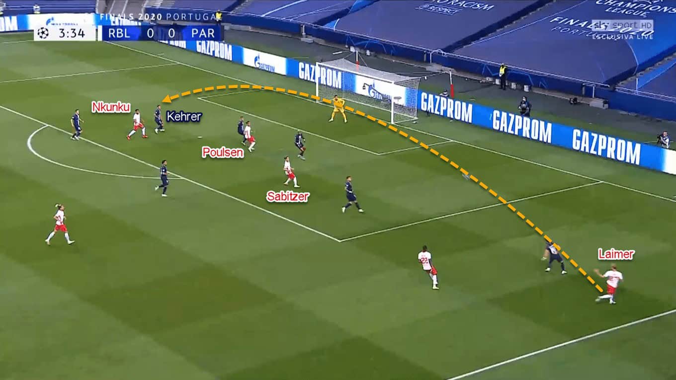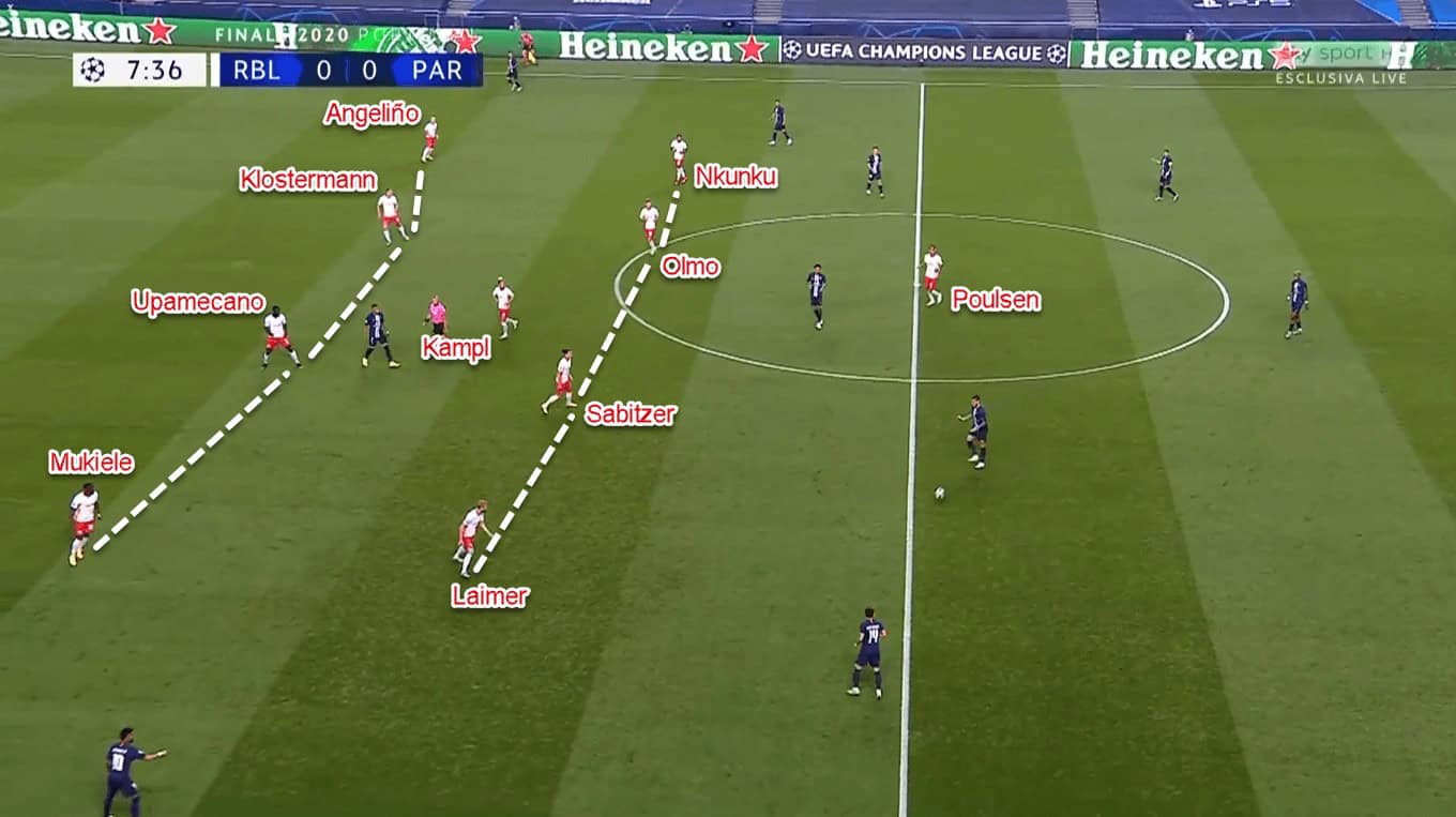 After that, Leipzig would continue the attack by sending the ball wide, either to Laimer or Angeliño. Both of them were tasked to send crosses into the box as soon as they reached PSG’s defensive third. In the box, there would be up to three options for the crosser: those being Poulsen, Nkunku, or Olmo, and one of the midfielders.