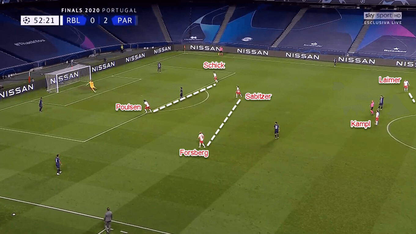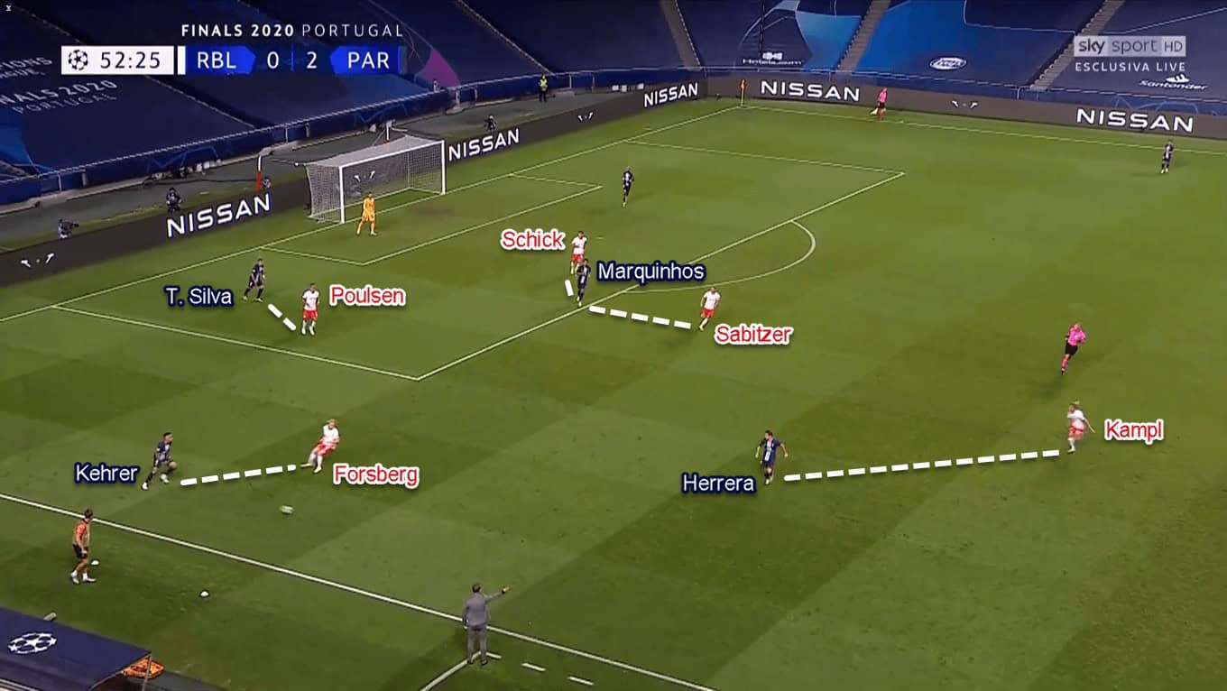 Leipzig’s first line of press consisted of two attackers: Poulsen and Schick. Behind them, two midfielders — Forsberg and Sabitzer — stood more advanced than Kampl. Those two lines of pressure were tasked to close the central lanes and force Les Parisiens to build through the flanks.