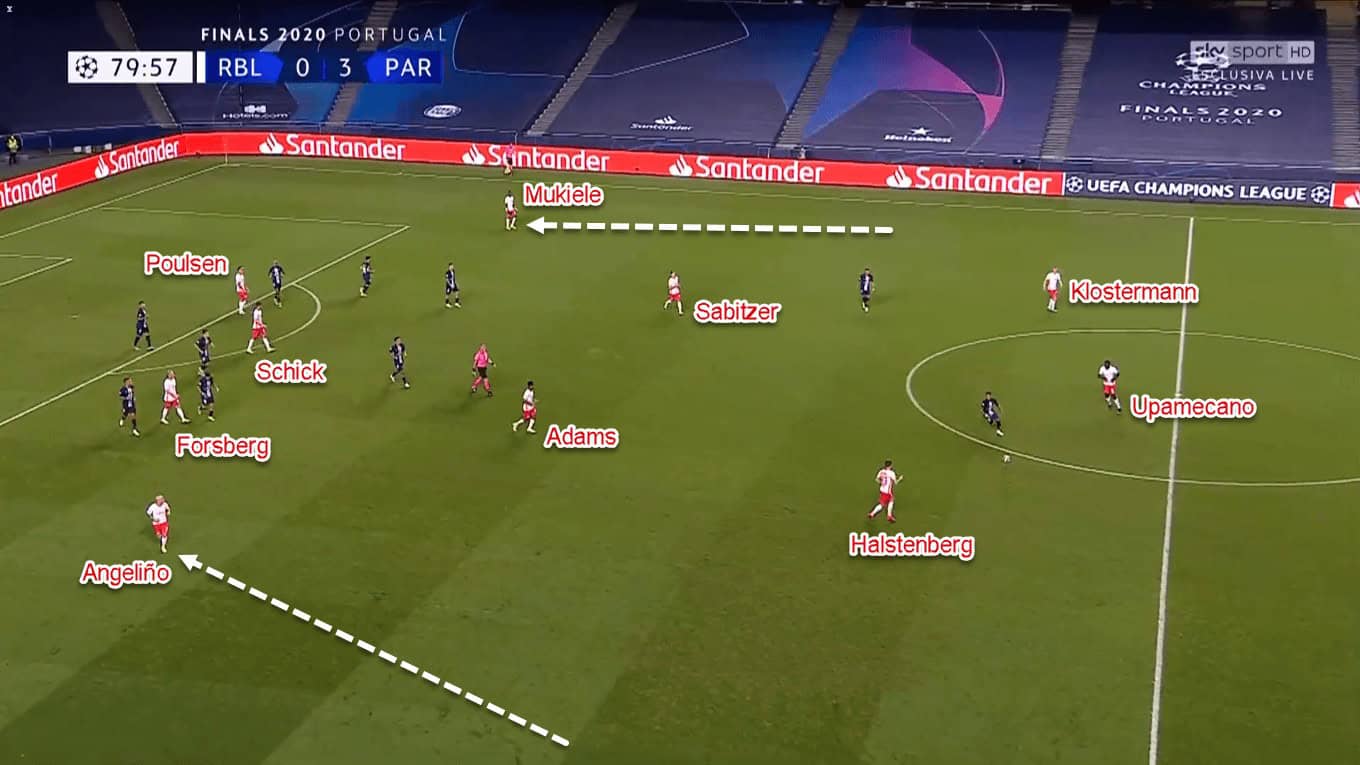 When Leipzig enjoyed the ball, they would shift from their initial 4–1–4–1 to a 3–2–5-ish shape. In that new structure, both full-backs had contrasting tasks. Mukiele was tasked to drop alongside the centre-backs while Angeliño had to step up and provide width in advanced areas.