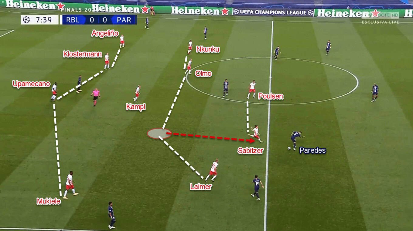 Leipzig’s first focus in their press was to shut Paredes down, due to the Argentine’s passing ability. In the process, Nagelsmann asked Marcel Sabitzer to step up from his initial position and press Paredes. To be more specific, Sabitzer would go alongside Poulsen to execute the press. His space then could be left temporarily empty or filled by the advancing defensive midfielder Kevin Kampl. This was the reason why we could see Leipzig in a 4–4–2-ish manner on some occasions.