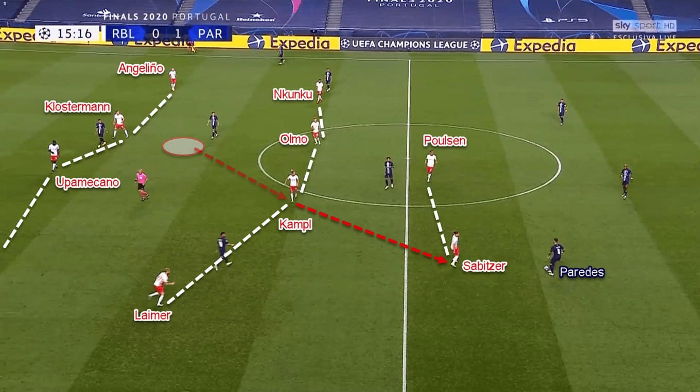 Similarly, contrasting tasks could also be found in the midfield line. One midfielder — Sabitzer — would drop alongside Kampl, while Olmo moved forward, even next to Poulsen at times. The former’s dropping movement would allow Leipzig’s centre-backs to have more vertical options in the middle. Meanwhile, Olmo’s rather free movement would give Leipzig more presence in their attacking line.