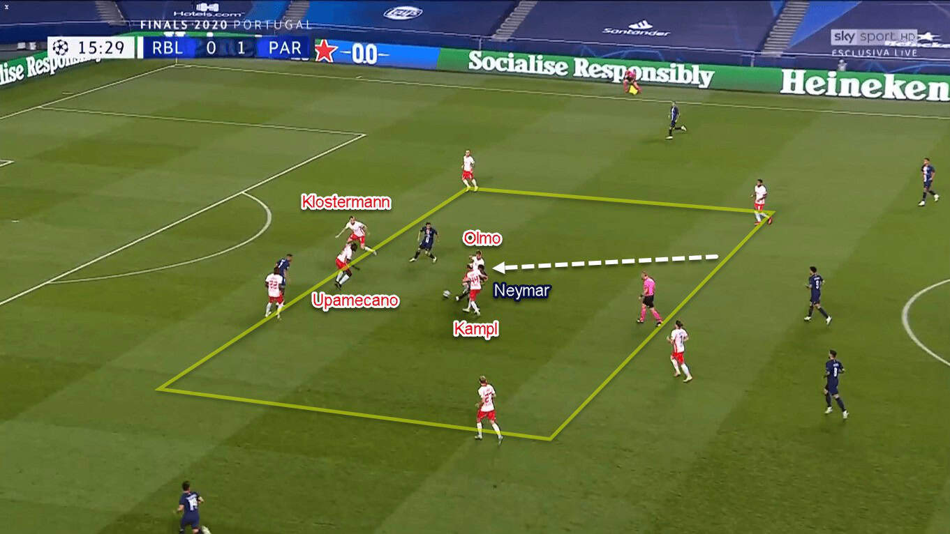 If the ball reached Neymar (or any Paris player in between the lines), Leipzig would surround the on-ball opponent with two to four players. Those include the marauding ball-side centre-back, Kampl, and at least one of the central midfielders: either Dani Olmo or Sabitzer would happily drop and back-press the man in blue. By doing that, Leipzig prevented Neymar from having much time and space to create chaos, and sometimes even gave themselves the chance to win the ball back.