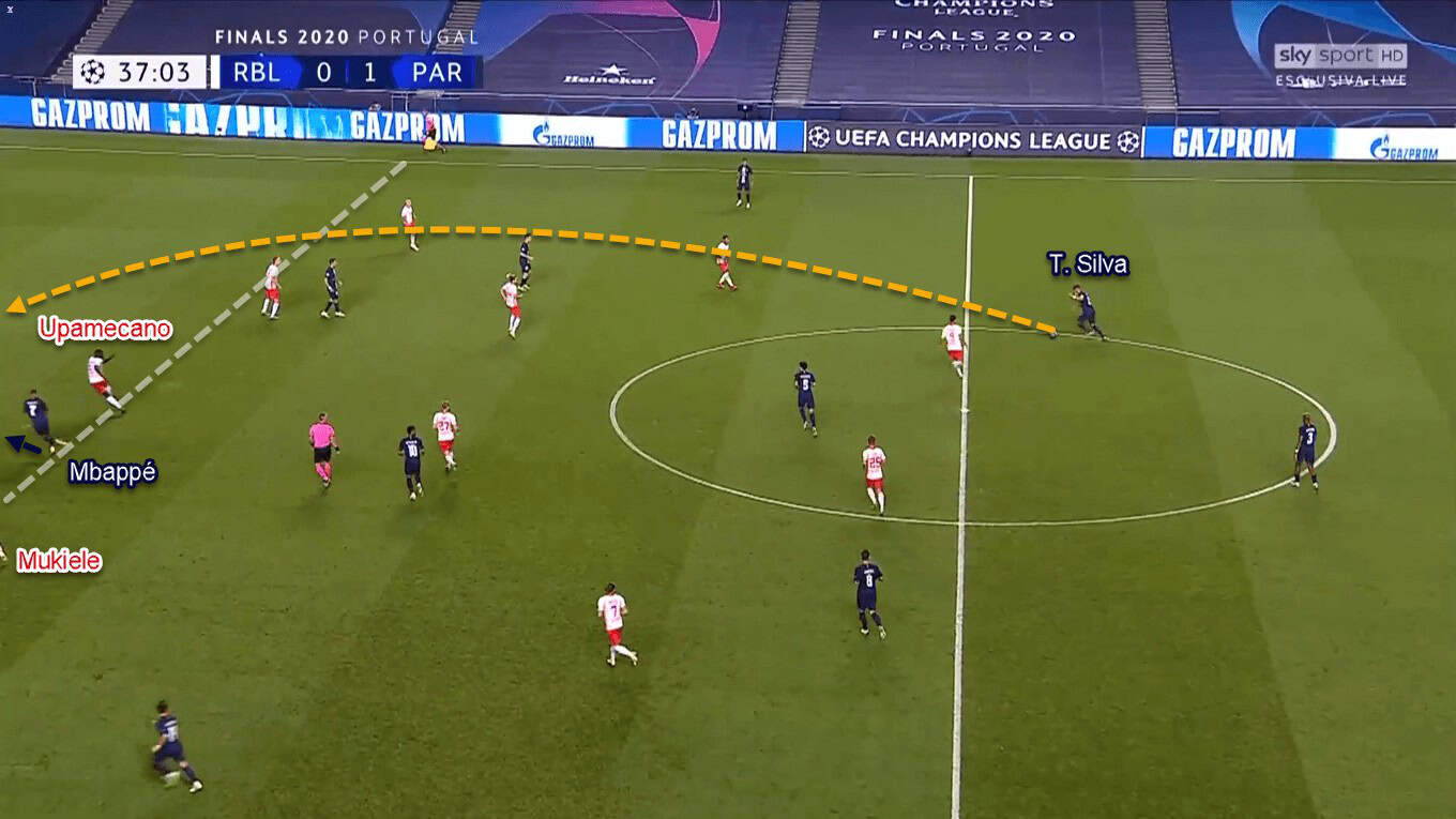 Knowing that Die Roten Bullen defended very compactly, Paris tried another way. That was by utilising Silva’s passing ability to find Mbappé in behind. This particular strategy was also chosen to exploit Leipzig’s rather high defensive line. However, this approach didn’t bear much fruit because of Upamecano’s brilliance to cut Silva’s lofted passes. The statistics showed Upamecano finished the game with three (75%) interceptions and five (71.43%) defensive duels won – the best rates among his teammates.