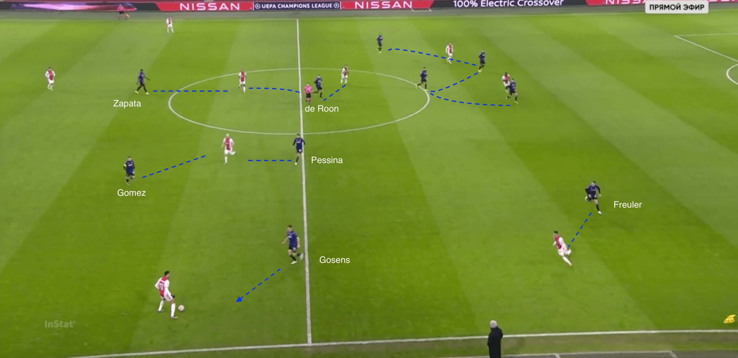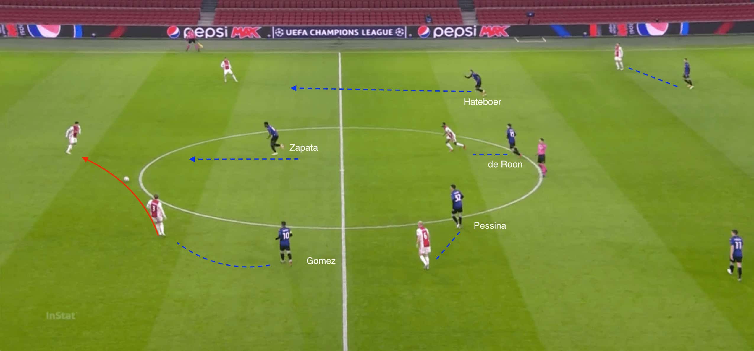 From the image above, both Zapata and Gómez are using their cover shadows to prevent Ajax’s holding midfielders from receiving the ball. If the Dutch champions manage to break the first line of defence, then two of the three central midfielders for Atalanta will be touch tight as they receive the ball.