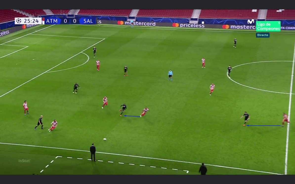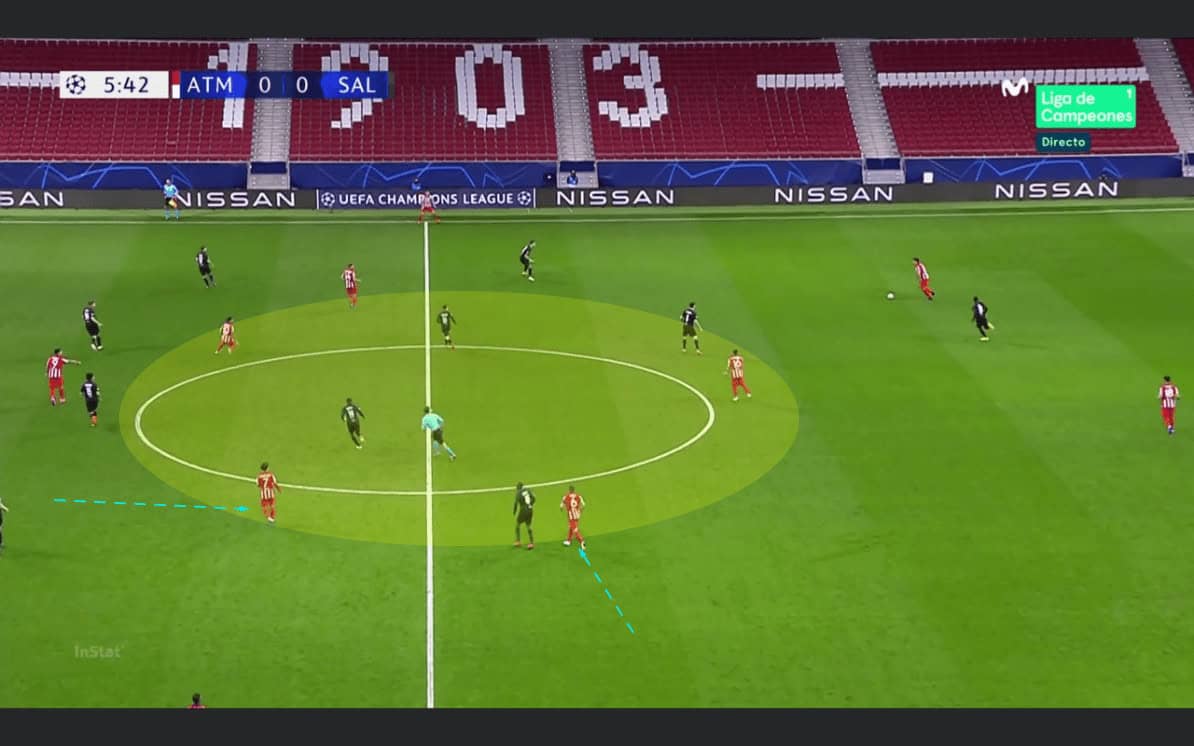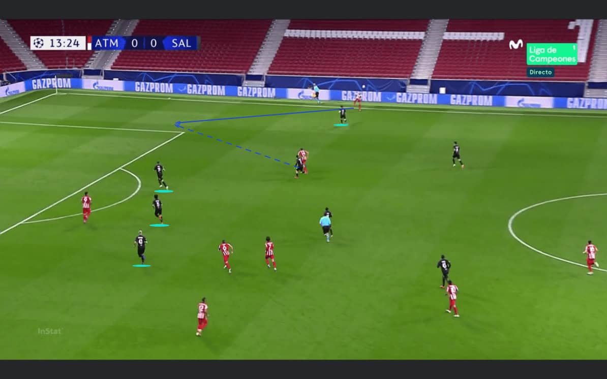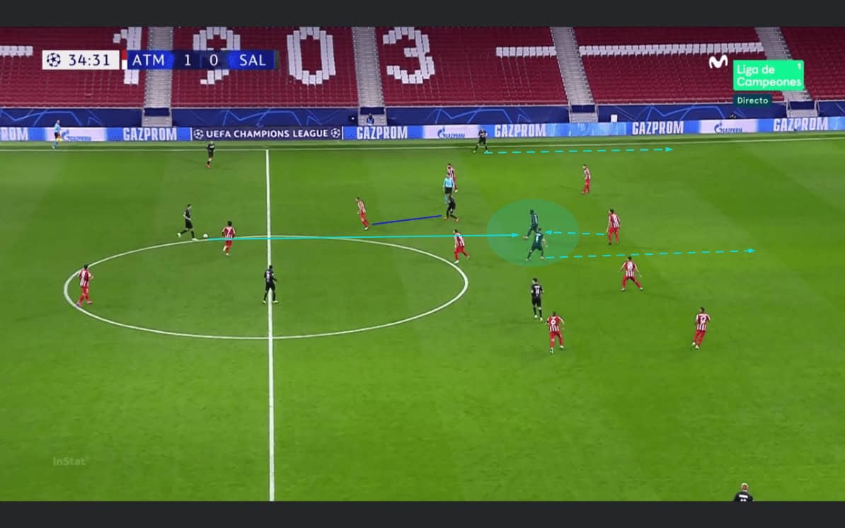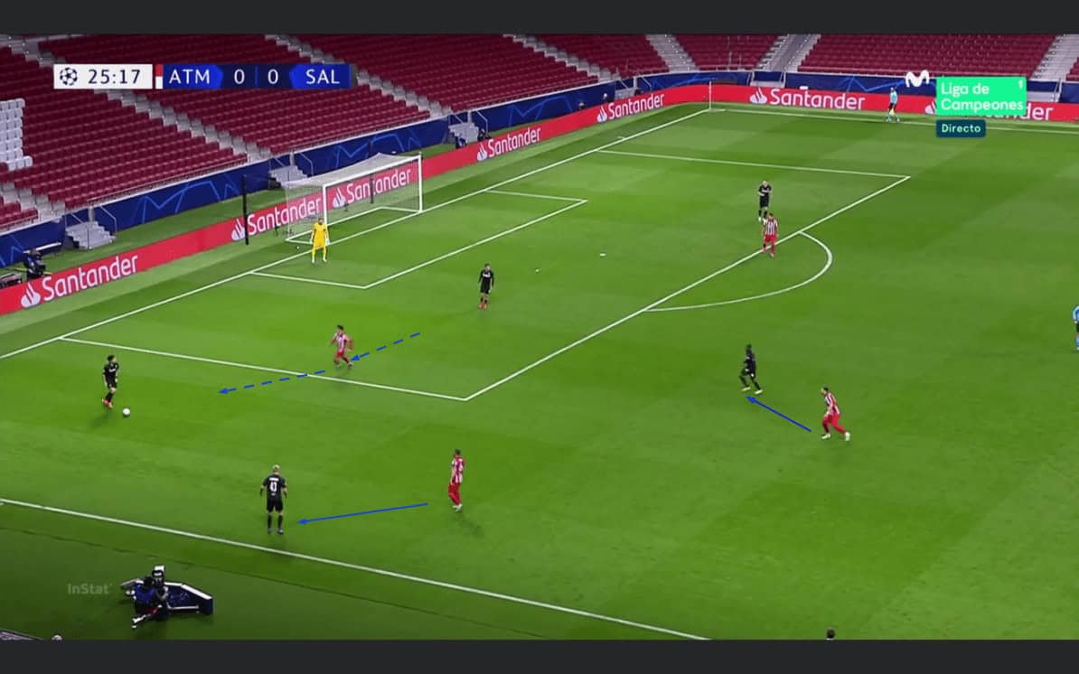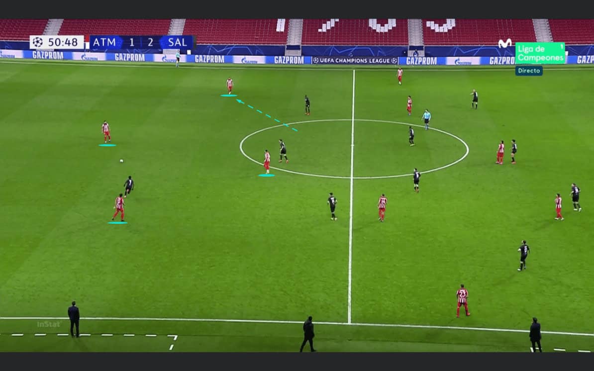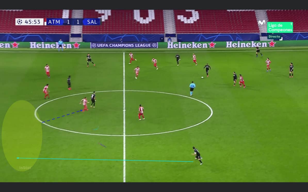 Atletico could now progress to the final third when the full-back possessed the ball in this area as a 1 vs 1 situation occurred on the outside. This meant that the Salzburg full-back had to step out and leave his last line to press the outside. Consequently, space opened up between the full-back and centre-back channel. Once Atleti penetrated this channel, a simple ball into depth by the full-back caused danger from a potential cross coming in.