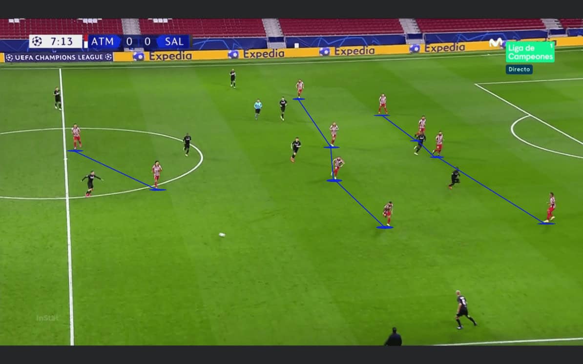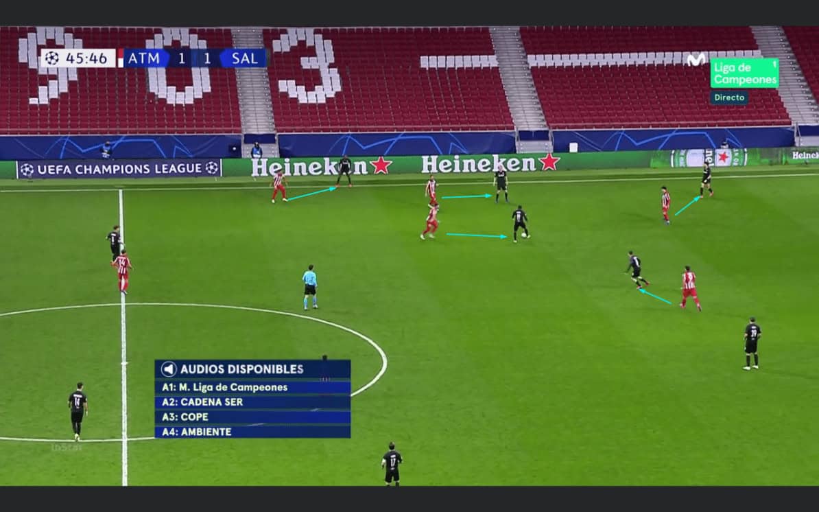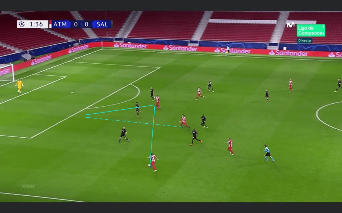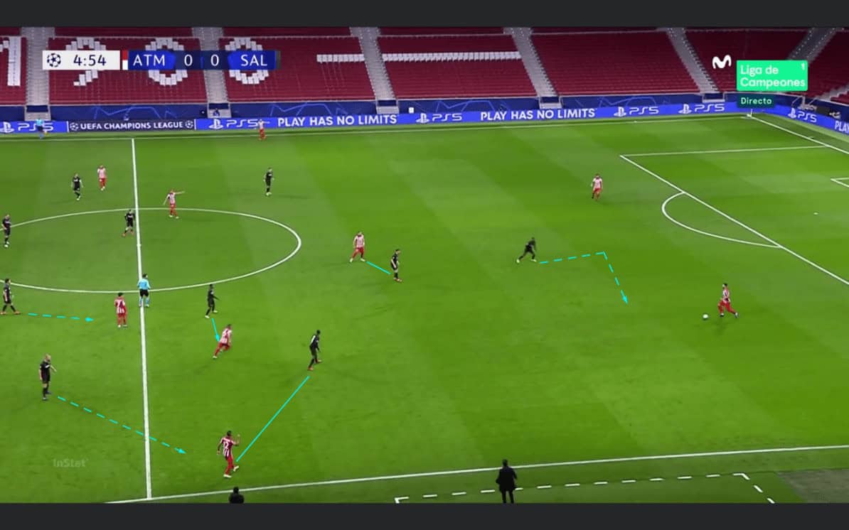 As Salzburg took the lead, Simeone had one more trick up his sleeve. In order to break down the away side, Simone asked Koke to drop next to the centre-backs and create a back three in possession.