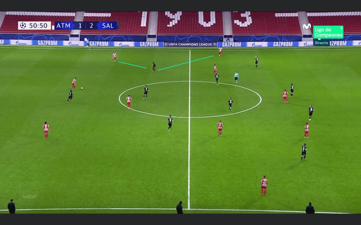 The wingers also struggled as a result and eventually opened up more space centrally because of this move. The situation occurs where the Salzburg wingers cannot close the wide centre-back and the full-back at the same time. Consequently, the passing sequences from outside to inside become a lot easier. In addition, when the winger would stay on the outside to close the passing lanes to the outside, as we can see in the example below, space opens up centrally. With space opening up, more chances were created and eventually, Atletico Madrid turned the game back into their favour.