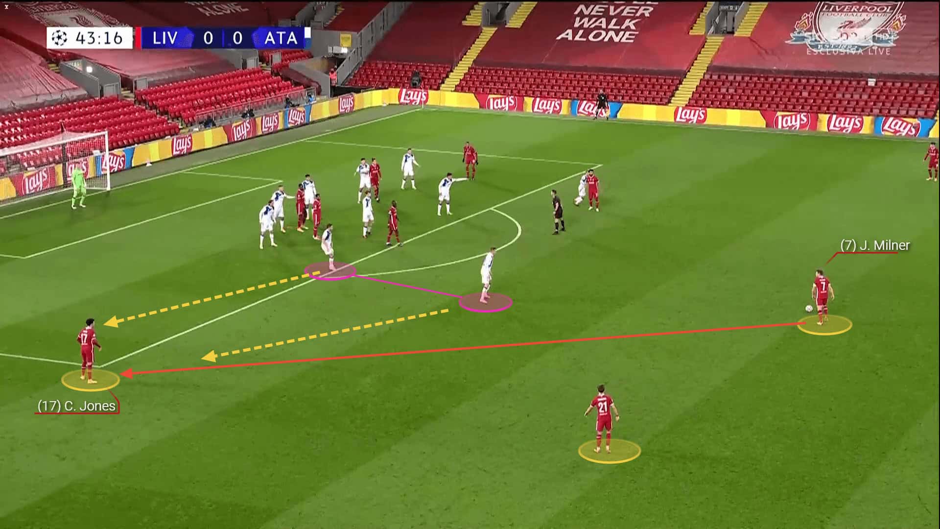 Jones and Milner were quite active all over the pitch, but Liverpool didn’t manage to get use of the wide areas thanks to the wing-backs’ defensive contribution. They were completely committed to positioning smartly so they always have the chance to drop back. While the two Liverpool players tried occupying the half-spaces too and create combinations with the attackers, they would often get stuck there as a result of Atalanta’s positioning that limited the passing options.