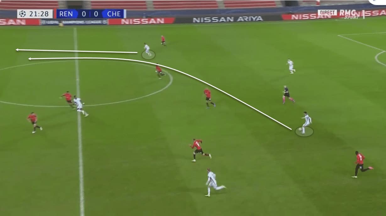 As the image above illustrates, Rennes had committed some players forward but the far side was unprotected. The pass from Mount is one Chelsea have used extensively before with Jorginho often using this pass. Hudson-Odoi controlled the ball and dribbled through to score.