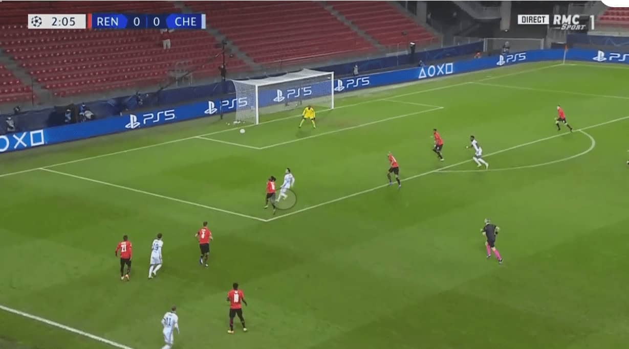Unsurprisingly, Chelsea’s opening goal came from the wide areas through a Hudson-Odoi run down the right channel. After dispossessing Rennes in their own half, Chelsea managed to transition into the opposing half through one long pass by Mount which set Hudson-Odoi away. The Rennes full-back was caught out and couldn’t match the winger for pace.