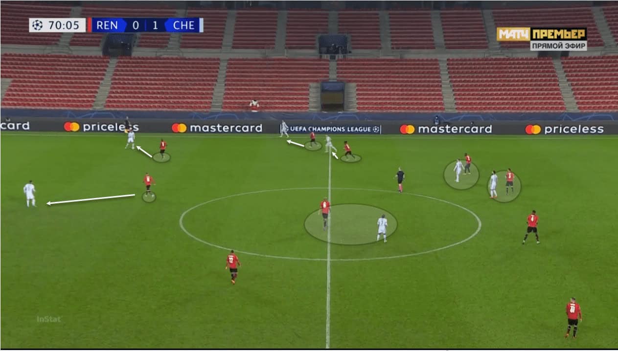 This troubled Chelsea more as the game wore on because Rennes held more possession. Mount is the best off-the-ball presser in that midfield set-up and the absence of Kanté meant Chelsea lacked a pure ‘seek and destroy’ midfielder. As you can see in the image above, Bourigeaud, N’Zonzi, and Cavaminga are centrally positioned which forces Chelsea to defend more narrow. You can see Rennes’ two wide players stationed outside of Chelsea’s wide players and were trying to use this method of build-up and attack. The Blues opted for a 4-5-1 out of possession to pack the midfield with numbers and stop the French side.