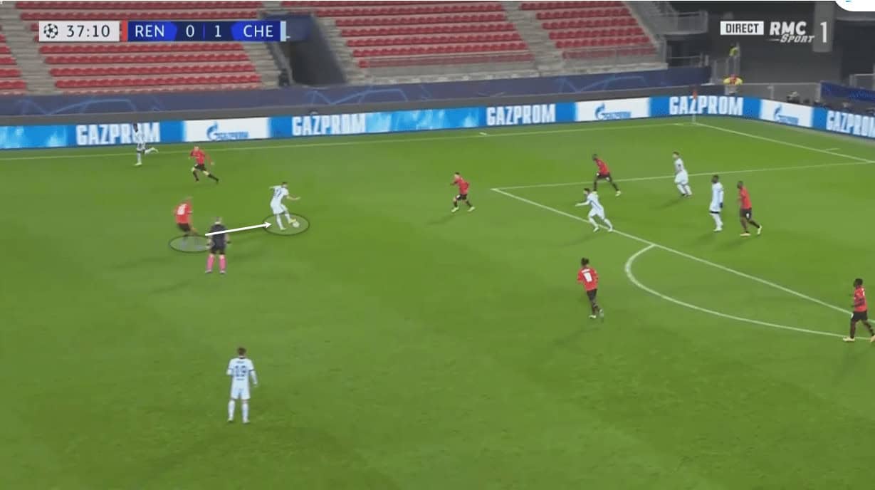 If we look at the image above, we can see Rennes keeping a compact shape but most importantly, Chelsea’s forwards and midfield are isolated. There are no midfield runners to take advantage of the gaps because all three players – Giroud, Werner, and Hudson-Odoi, all prefer the ball to feet. The departure of Mount meant Chelsea had more ball control but lost some off-the-ball running. Mount and Havertz would usually take advantage of the space we can see in between the lines and with neither on the field at that point, it meant Chelsea lacked a runner. Rennes were able to block easy passing lanes and held their man-marking plan even here.