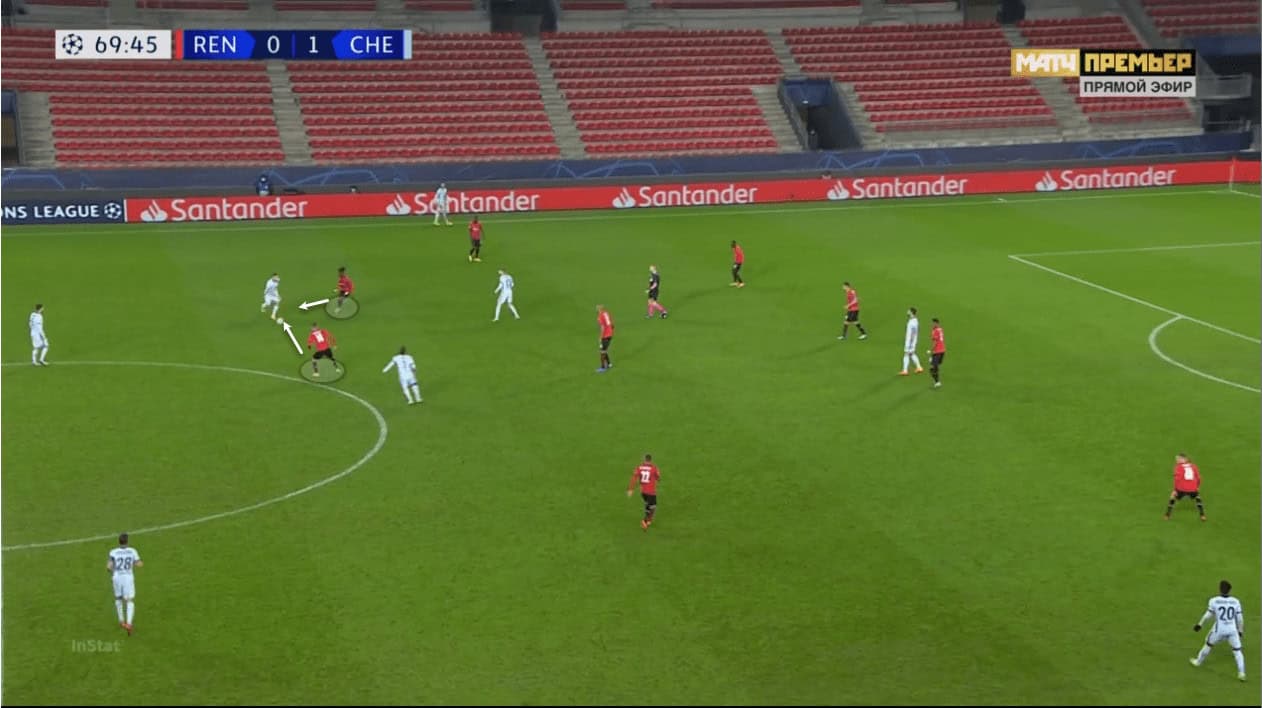 The image above shows Rennes playing in their 4-1-4-1 formation early on where they condensed the space between the lines, forcing Chelsea to find alternate options forward. You can see how high Chilwell is on the left but given the extra man in midfield, Rennes’ plan was to use him, in this case, N’Zonzi, to match them. This is where the single-pivot becomes useful. Their defensive tactics were a lot more visible as they settled into the game. Rennes adopted a man to man pressing approach where the pressing triggered in midfield. The attackers applied pressure on Chelsea’s defenders which at times forced them to play it into midfield. Any time the ball dropped to one of the Chelsea midfielders, Rennes would be triggered into an aggressive press.
