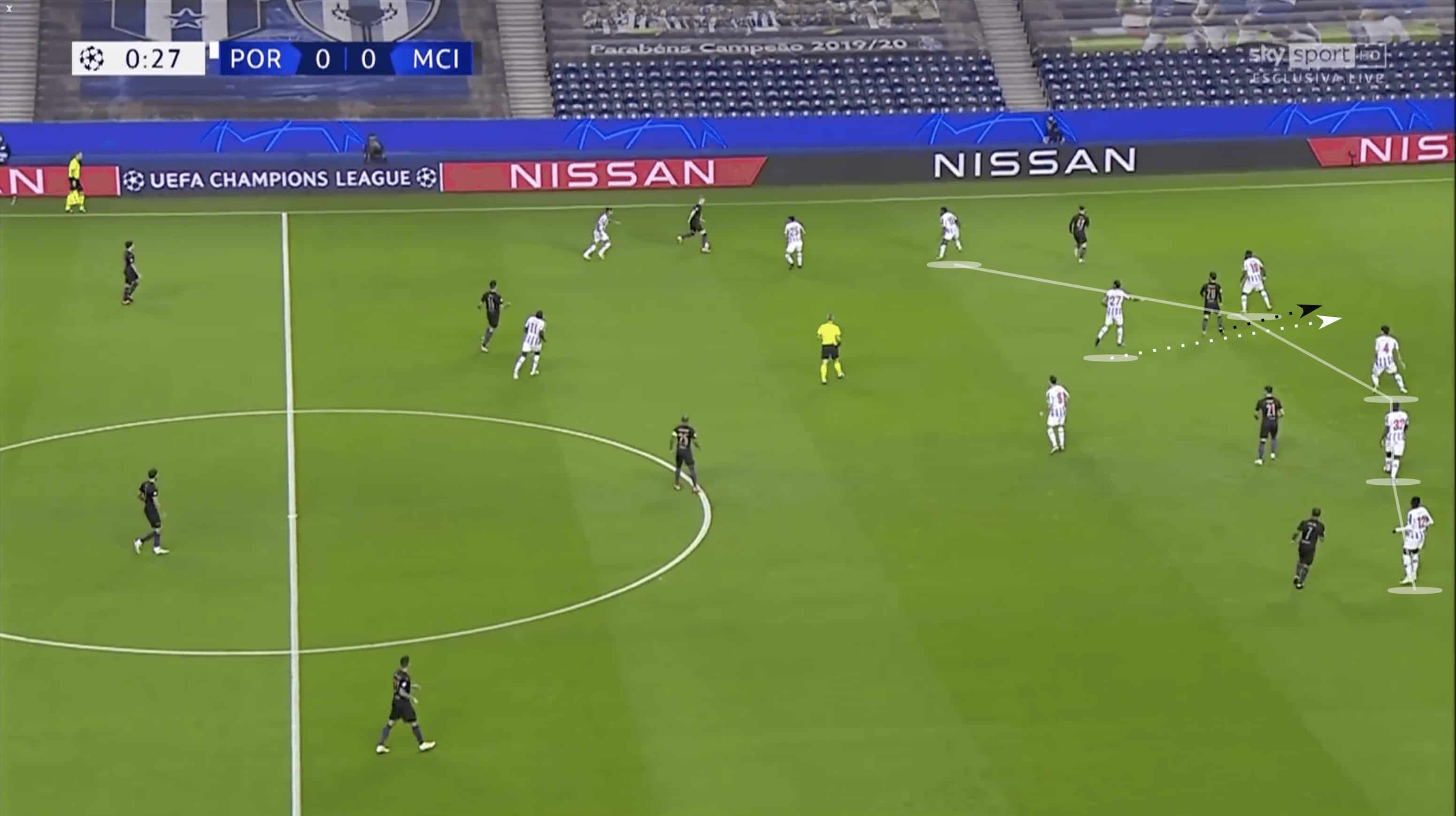 One of the key parts of this way to make sure they had numerical superiority in the centre of the pitch. Their defensive midfielder, Sérgio Oliveira, worked to follow central runs from City players. City often had four to five attackers on the line with Porto, looking to confuse them and force defenders to make decisions upon who to mark. This makes runs from deep even more dangerous because the run from a City player would add additional pressure to the defender. To negate this, Porto made sure to drop Oliveira with any of the runners, as shown above. This ensured that Porto maintained their superiority and defenders didn’t have to have additional decision-making put upon them.