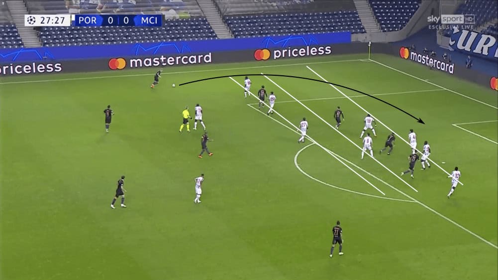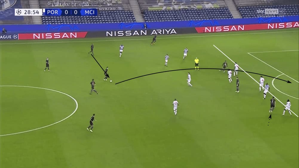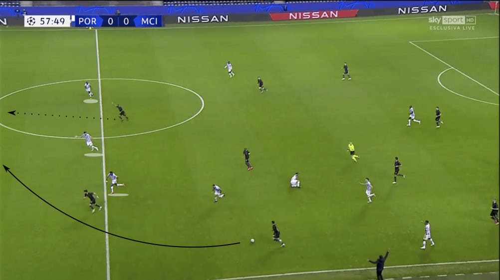 Man City knew that Porto would sit deep, especially under the qualifying circumstances that meant Porto had a good chance of advancing to the knockout rounds if they could find a point. Being the aggressors that they often are, City knew that much of the match they would have to find ways through the aforementioned 5-3-2. One aspect of positional play is to move your opponent so that you can exploit the space that they vacate. City looked to do just that any time Porto stepped higher up the pitch. While none of them were successful, the manipulation of their opponent led to some of City’s best chances of the evening.