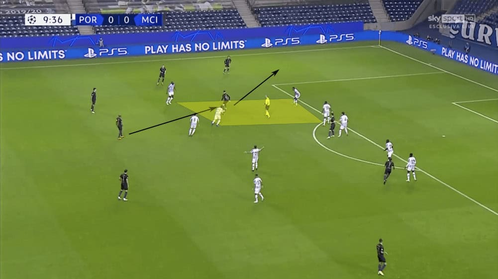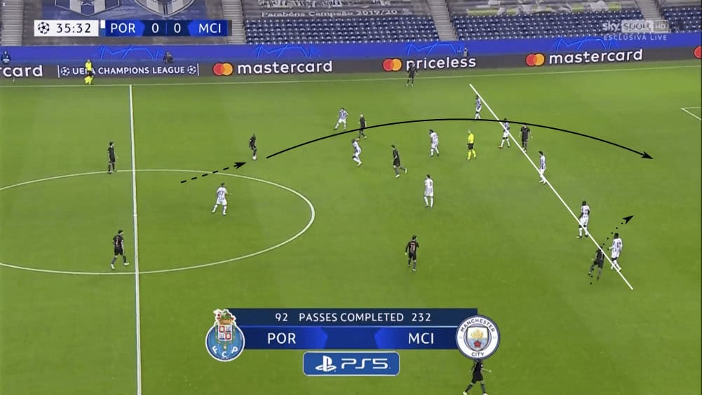 In the image above, Oliveira had dropped down in order to occupy the space that had opened up in the backline. This positioning is much better than the original, which would have seen him standing in his own teammate’s cover shadow. This movement allows Porto to have two numerical overloads: one on the ball and one in the centre of the pitch. City attempted to play through these, but Porto’s numerical advantage frustrated them for most of the match. The result would be City going back to their defenders or defensive midfielders and look to switch play to the other flank.