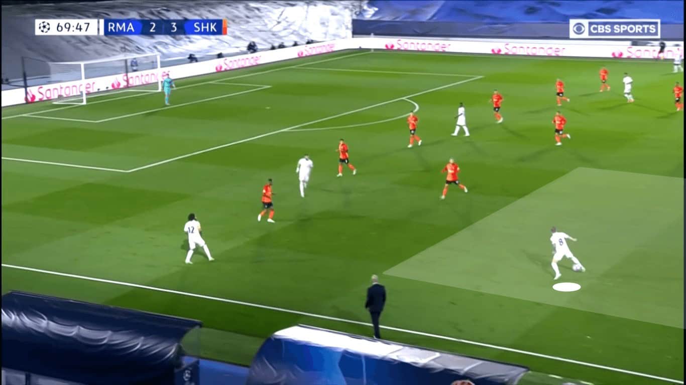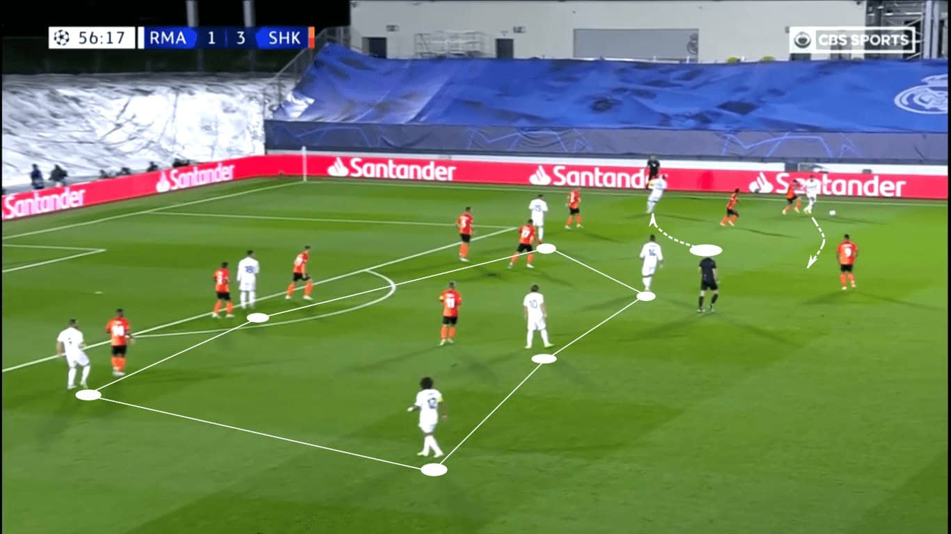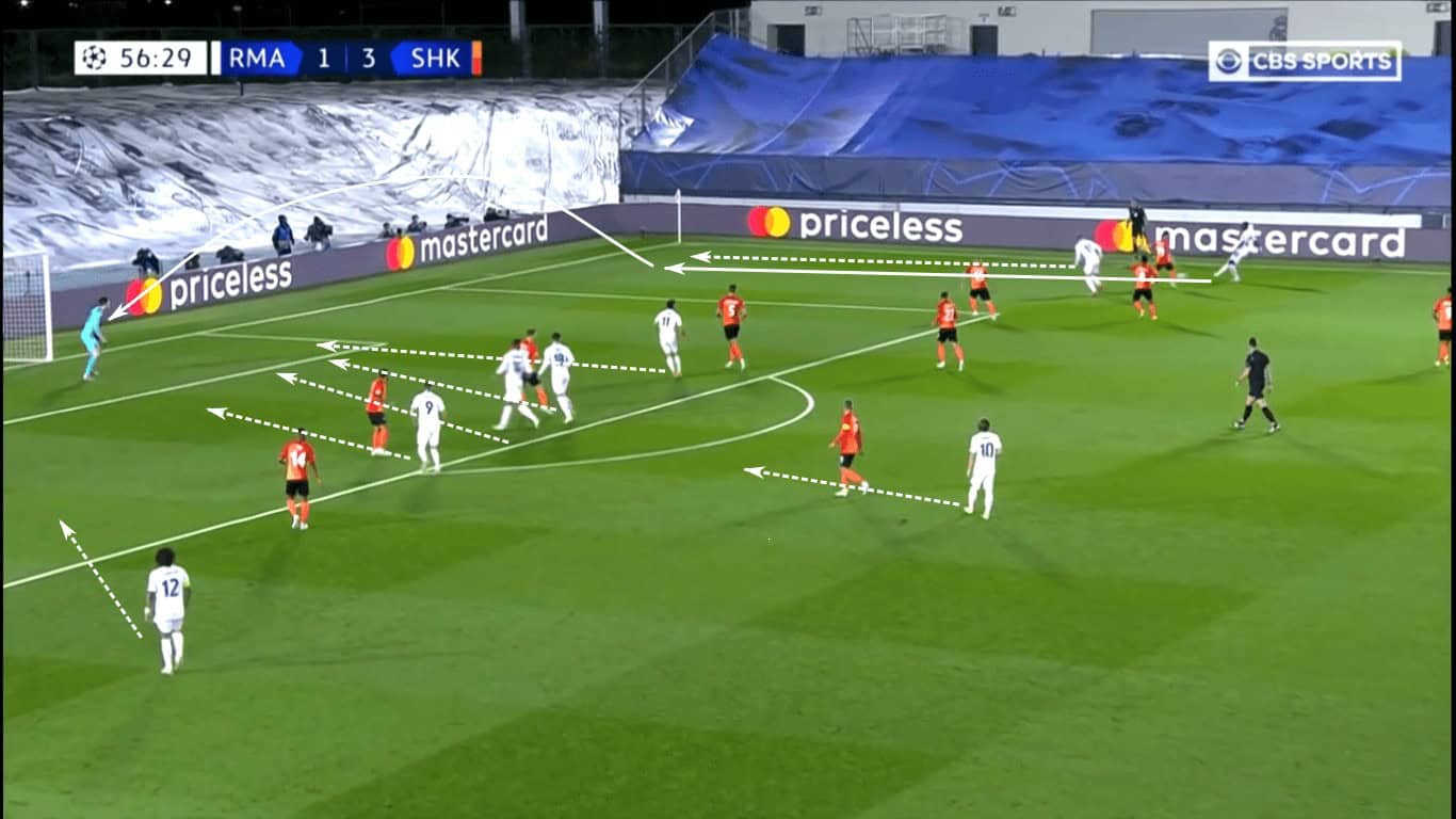 For the majority of the second half, Los Merengues overloaded the middle of the pitch, leaving one player on either wing to provide width. Since Shakhtar was also overloaded in the middle, Real Madrid’s emphasis in central numbers wasn’t to create opportunities through the middle. Rather, it was to set up crosses or play runners into the half spaces, allowing them to make the final pass closer to goal.