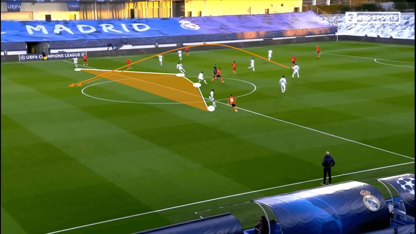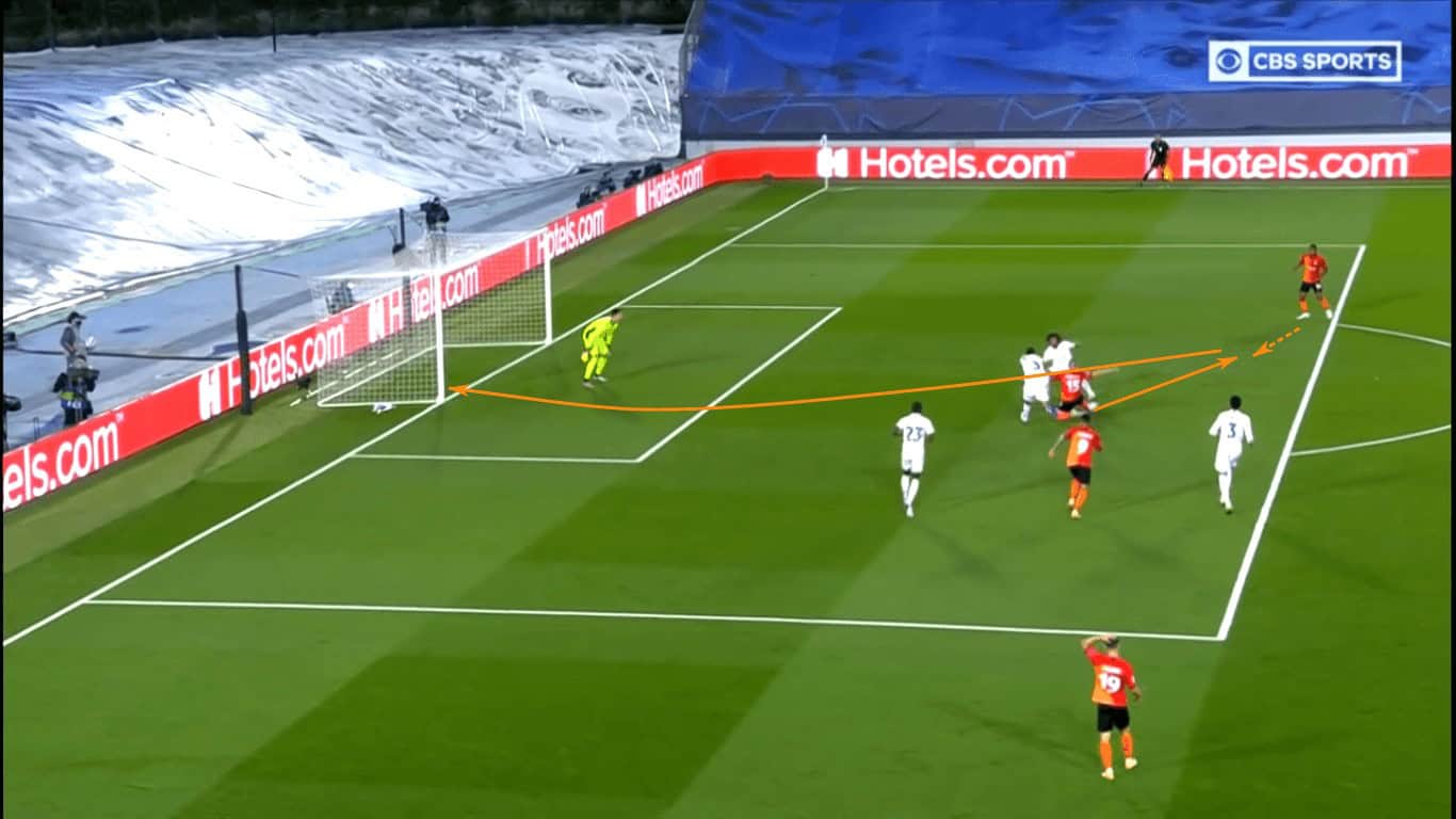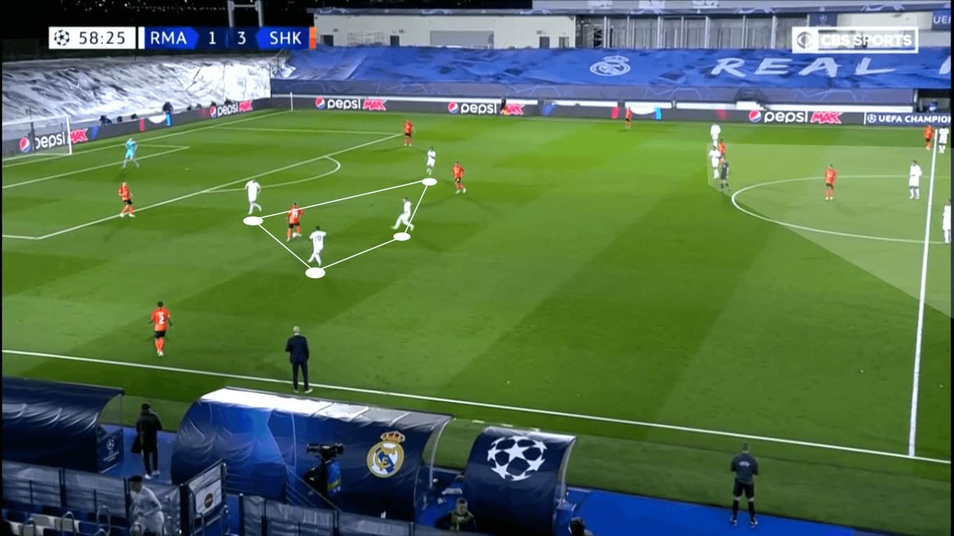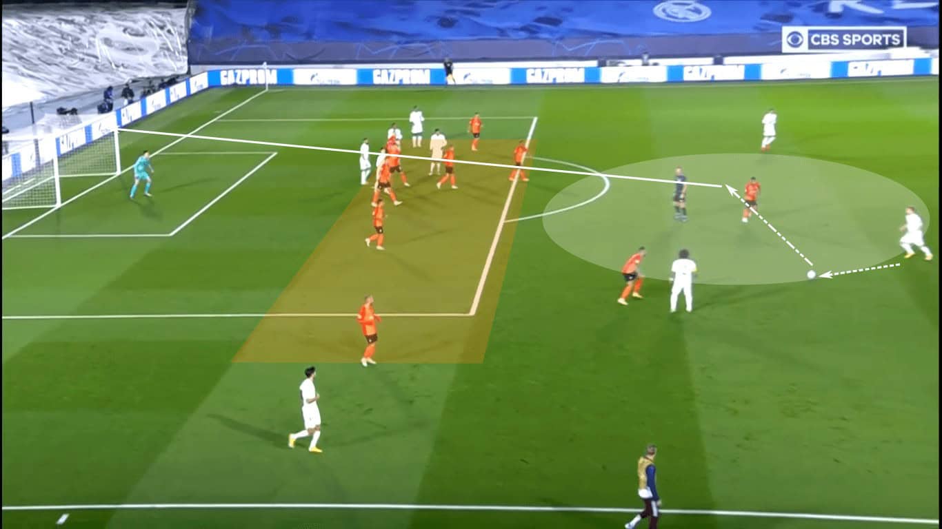 For the majority of the second half, Los Merengues overloaded the middle of the pitch, leaving one player on either wing to provide width. Since Shakhtar was also overloaded in the middle, Real Madrid’s emphasis in central numbers wasn’t to create opportunities through the middle. Rather, it was to set up crosses or play runners into the half spaces, allowing them to make the final pass closer to goal.