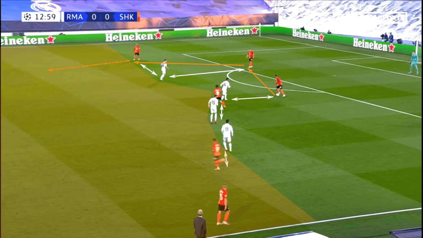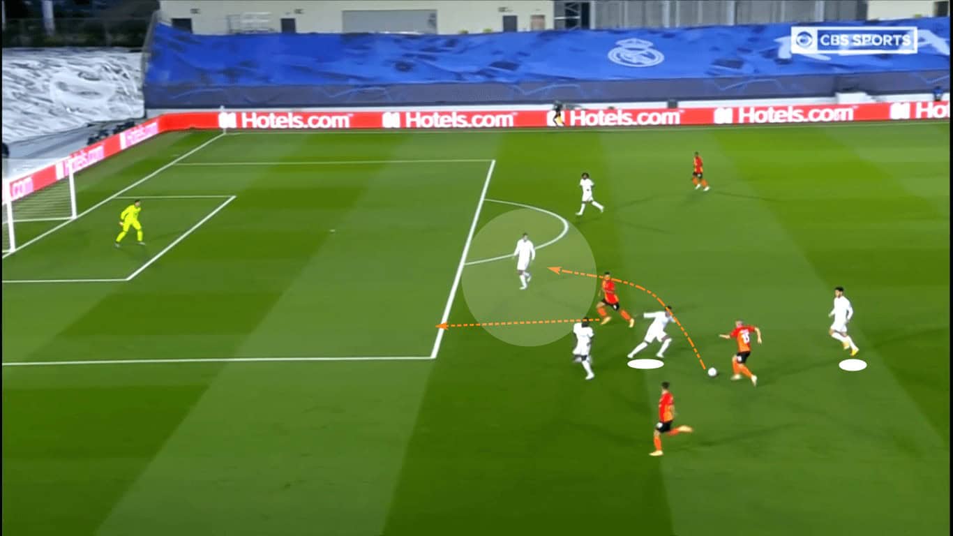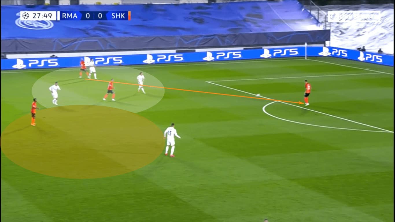 Though Marlos was able to progress through the dribble, Real Madrid’s backline was initially very disciplined. Since the centre-backs hadn’t pushed into the midfield, the Hirnyky continued to patiently move the ball while casting glances downfield.