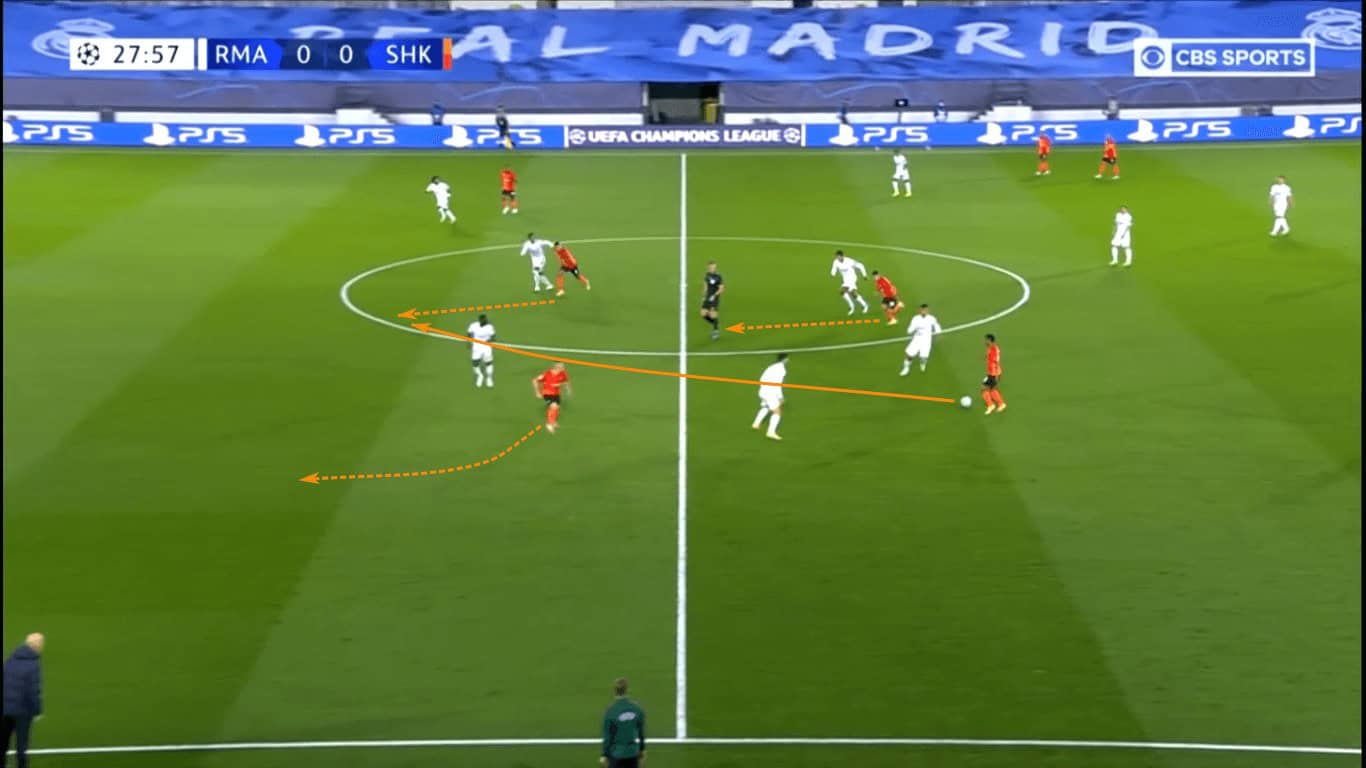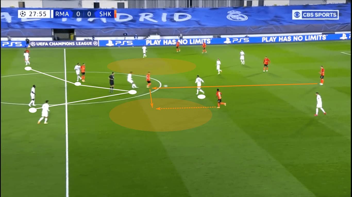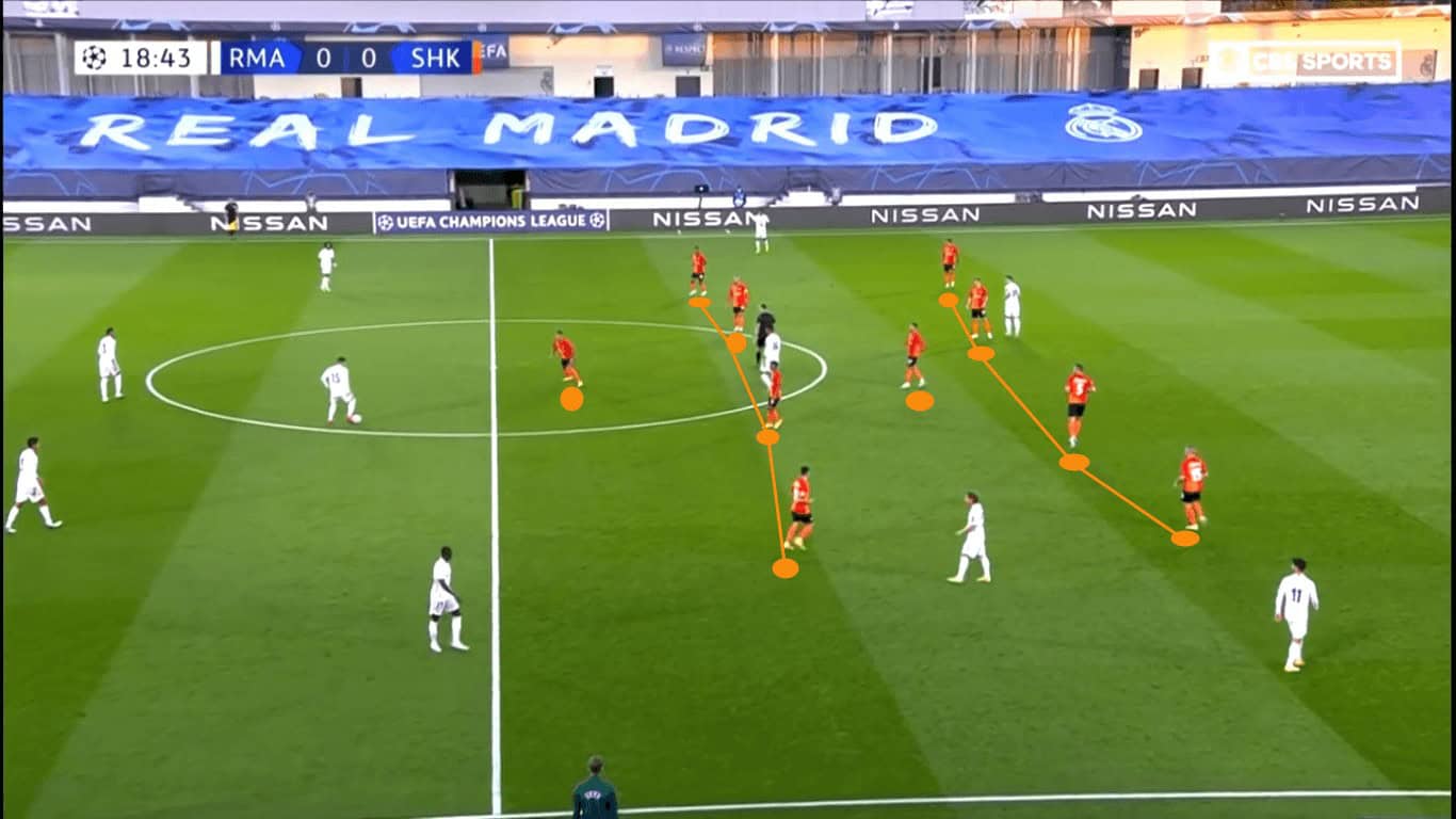 Though Marlos was able to progress through the dribble, Real Madrid’s backline was initially very disciplined. Since the centre-backs hadn’t pushed into the midfield, the Hirnyky continued to patiently move the ball while casting glances downfield.