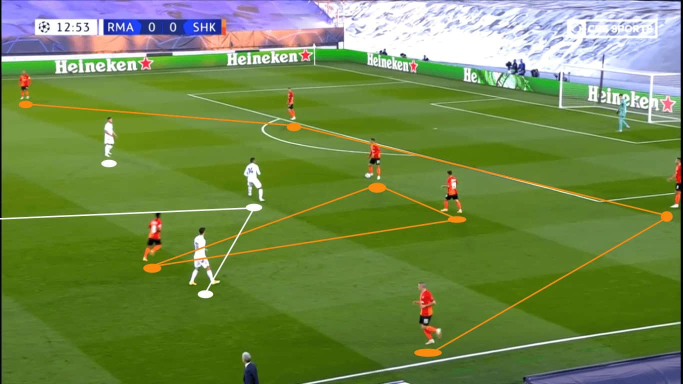 In the sequence below, we see Shakhtar’s backline and central midfielder drop deep to participate in the build-up. At the moment, only three Madrid players have moved into the attacking third, cueing the team in orange to keep circulating possession.