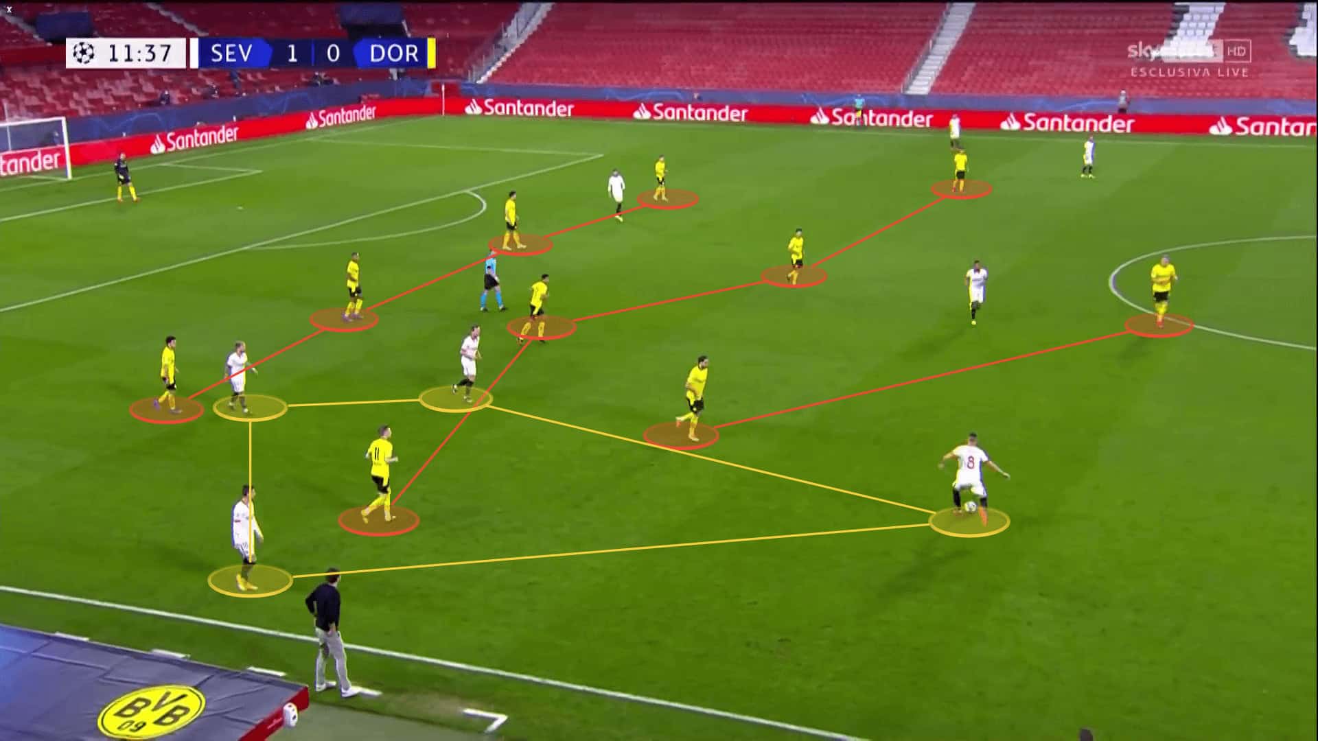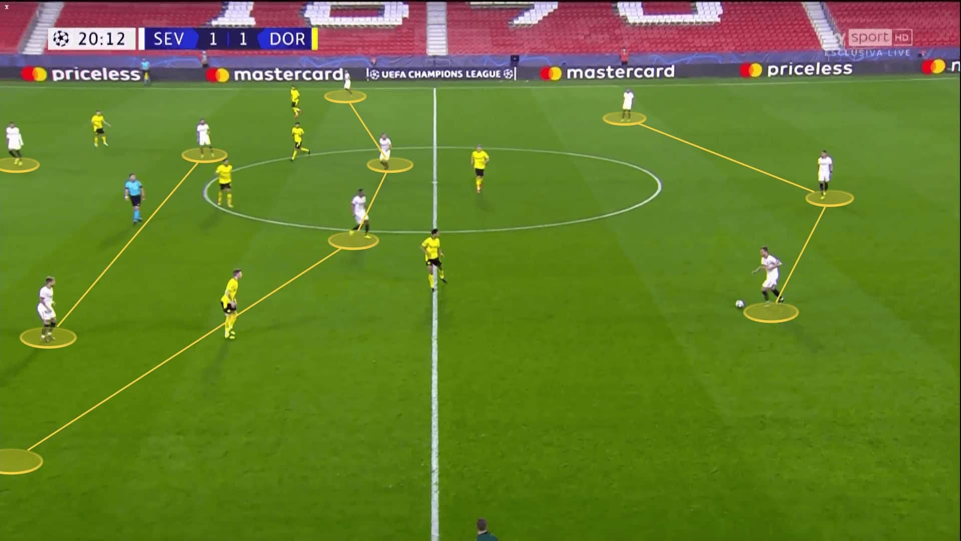 Borussia’s 4-4-2 in defence and Sevilla’s forced switch of play.