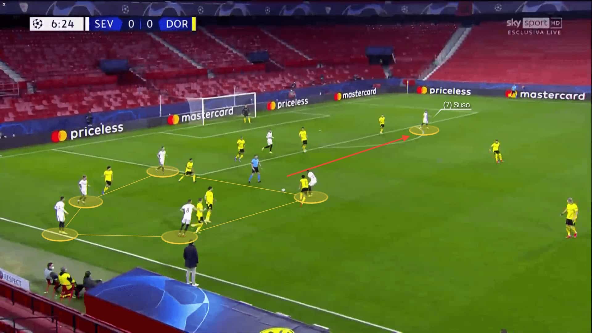 Sevilla overloading the left flank and then switching play to Suso on the other side.