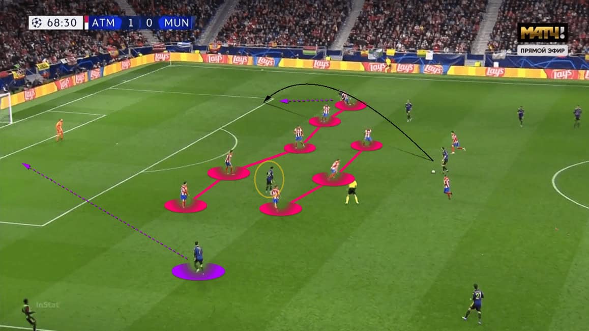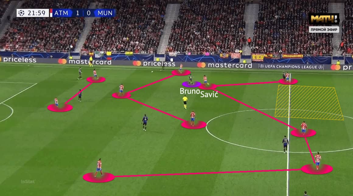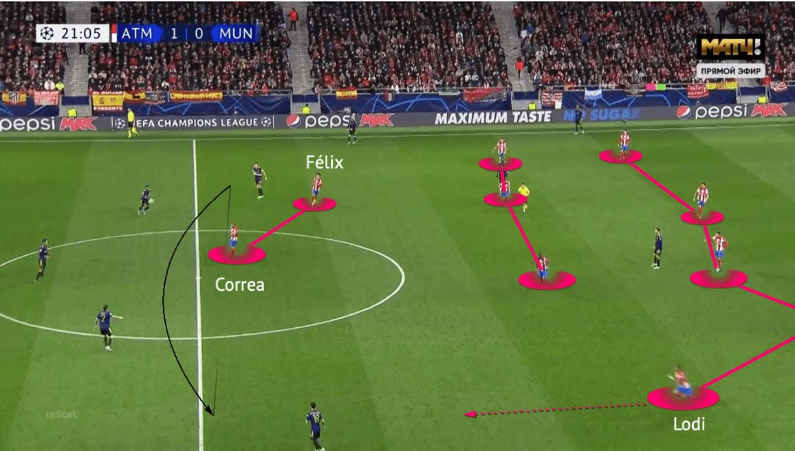 On the left side, the press of Atlético was a bit different. Simeone’s side was brave on that night and wanted to defend in the central third, not letting the opponents enter the last third easily. The weakness of a 5-3-2 was the limited horizontal coverage in the first two lines. So, the wing-back (Renan Lodi) from the opposite side would come very early to press the receiver. Compared to the right side, this press was rather vertical.