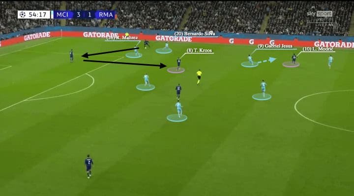 Below was a variant of the explained concept, as Jesus and De Bruyne were unable to press and close Kroos, Silva stepped up to press the German international. But he was a little bit late so Kroos found his angle to play the forward pass, and Modrić was waiting for that between the lines.