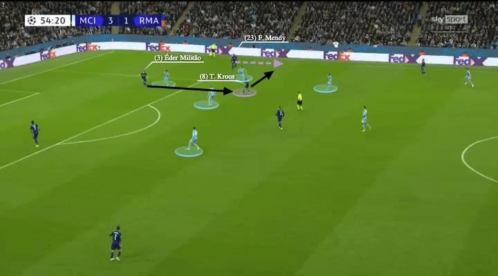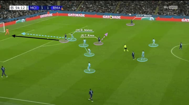 Here, when Mahrez pressed the goalkeeper all the way after the centre-backs went back, Kroos was moving between the lines with Ferland Mendy on the other side as well.