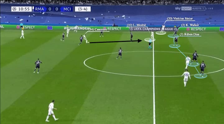 And as the ball reached Casemiro, you could see a Madrid move was on because they have a clear way of going behind City’s high line. In this game, Karim Benzema was more disciplined to stay in his striker position, alongside with Vinícius who also stayed higher to use his pace and 1v1 ability. But City were also cautious with Rúben Dias stepping out less frequent than last game in the first period, as they did not want to isolate Walker in those situations, so the tone of Madrid’s attack was more or less set in this way. When they have the chance, they can find Luka Modrić between the lines, but then the next action must be going behind and releasing the runners, if not using the big switch in the first move.