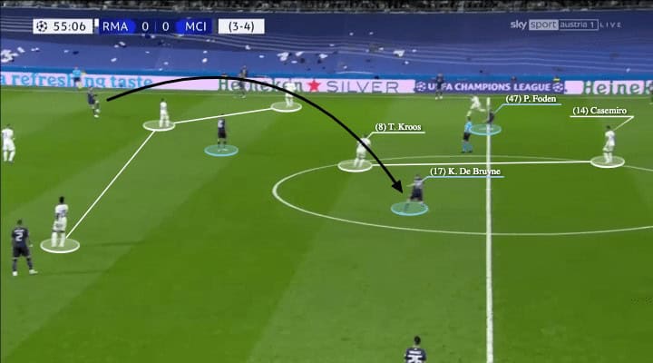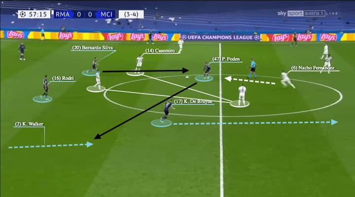 Then you could also see the players working in both half-spaces could interact and break the Madrid structure, as the position of Foden, Rodri, and De Bruyne shown here, they occupied different zones vertically and horizontally to split the Madrid 6, as now Kroos and Casemiro were in awkward positions and in the same vertical chain. Then, it was Laporte’s quality to find De Bruyne diagonally.