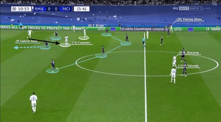 Another part of the setup, was clever as they played with two deep midfielders, as now Casemiro and Toni Kroos could watch each other and be more flexible with their positions. For example, when City tried to press with a 4-4-2 as shown above, they could not do it easily as they did in the first leg as there are two midfielder options given to centre-backs. When Gabriel Jesus jumped out too early to press, Casemiro could receive despite De Bruyne covering Kroos with his body angle.