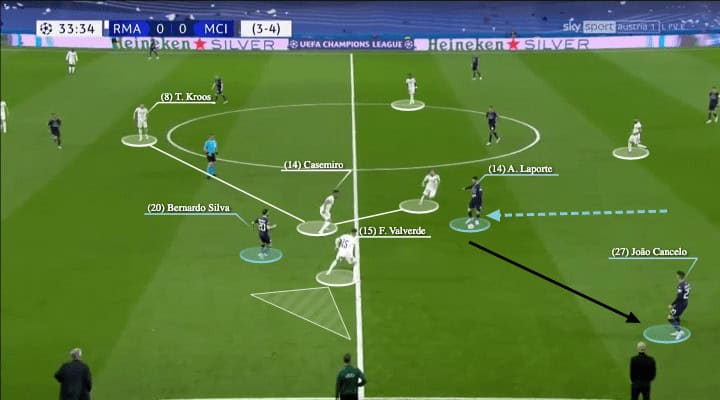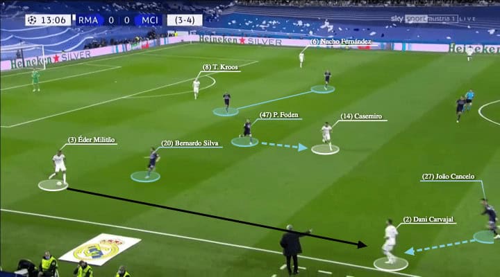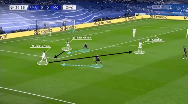 Here, because of the open Madrid shape in the attack, they were able to come out with a good sequence, as Militão was wide enough to pass before Bernardo Silva accessed him, but you could also see Casemiro’s willingness to play as he moved into space when the pass was made, so he arrived when the ball reached Carvajal.