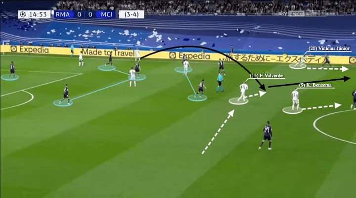 Here, the next example shows the versatile Valverde in Madrid’s structure. He was a midfielder but being placed as the right-winger, but of course, Ancelotti wanted to use his energy, the capacity of the run, and willingness to play in space to give the team dynamism, as we saw the Uruguayan player move into spaces behind the City press line to receive.