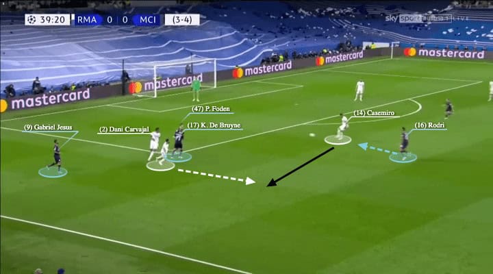 So, the situation became favourable to Madrid as De Bruyne stopped, but Carvajal continued. Even though Rodrigo Hernández moved out to press Casemiro, City were usually late to close the angle and Madrid were also alert to use the one-touch pass to evade pressure. Then, Carvajal received again in opened spaces and now Madrid could go all the way.