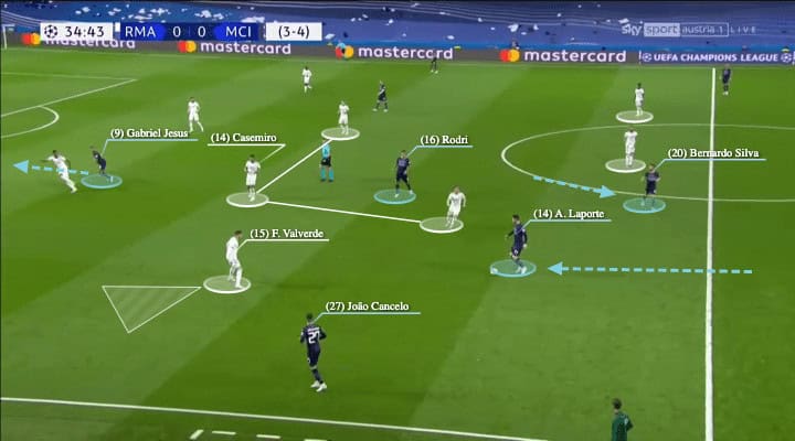 For City, the problem in their structure was losing the occupation of both half-space. When Silva, who played outside of the block and deeper in the first half, Pep’s side did not have enough players between the lines as only De Bruyne was there. Jesus and Foden were mostly making the forward runs and the mindset was more of going behind, so when Laporte carried the ball forward, as shown above, no one was there. On top of that, the Madrid structure of Kroos and Casemiro helping each other was protecting that area as well.