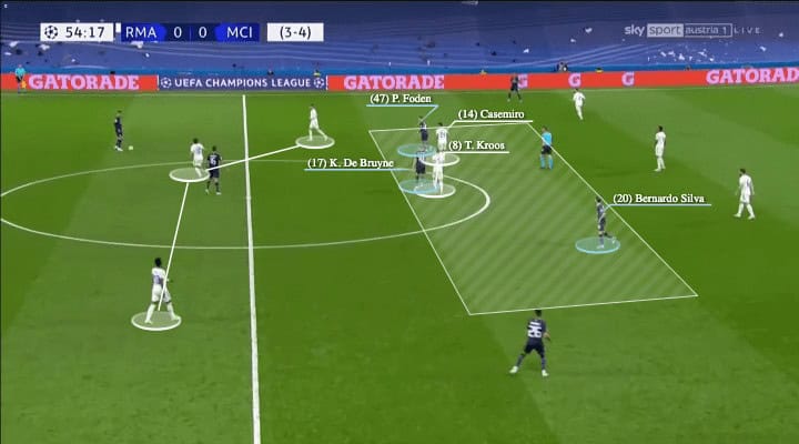 For instance, even though Madrid could deploy a 4-2-3-1 defensive shape when City put the players in spaces, they could create conditionally 3v2 by occupying more vertical zones, especially both half-spaces with Silva, Foden, and De Bruyne as shown above.