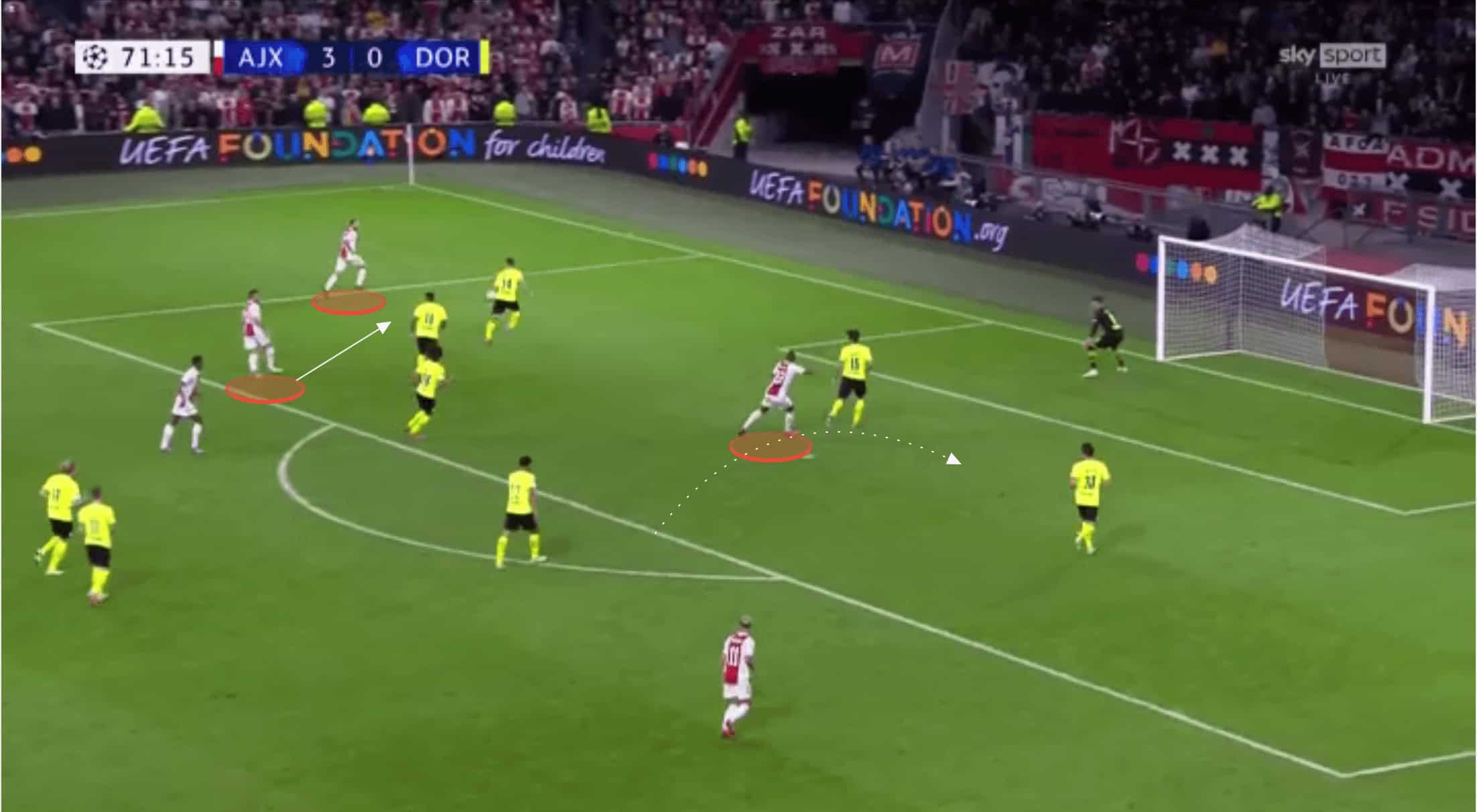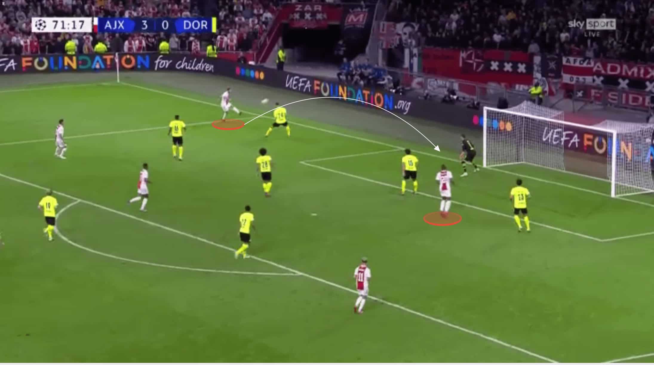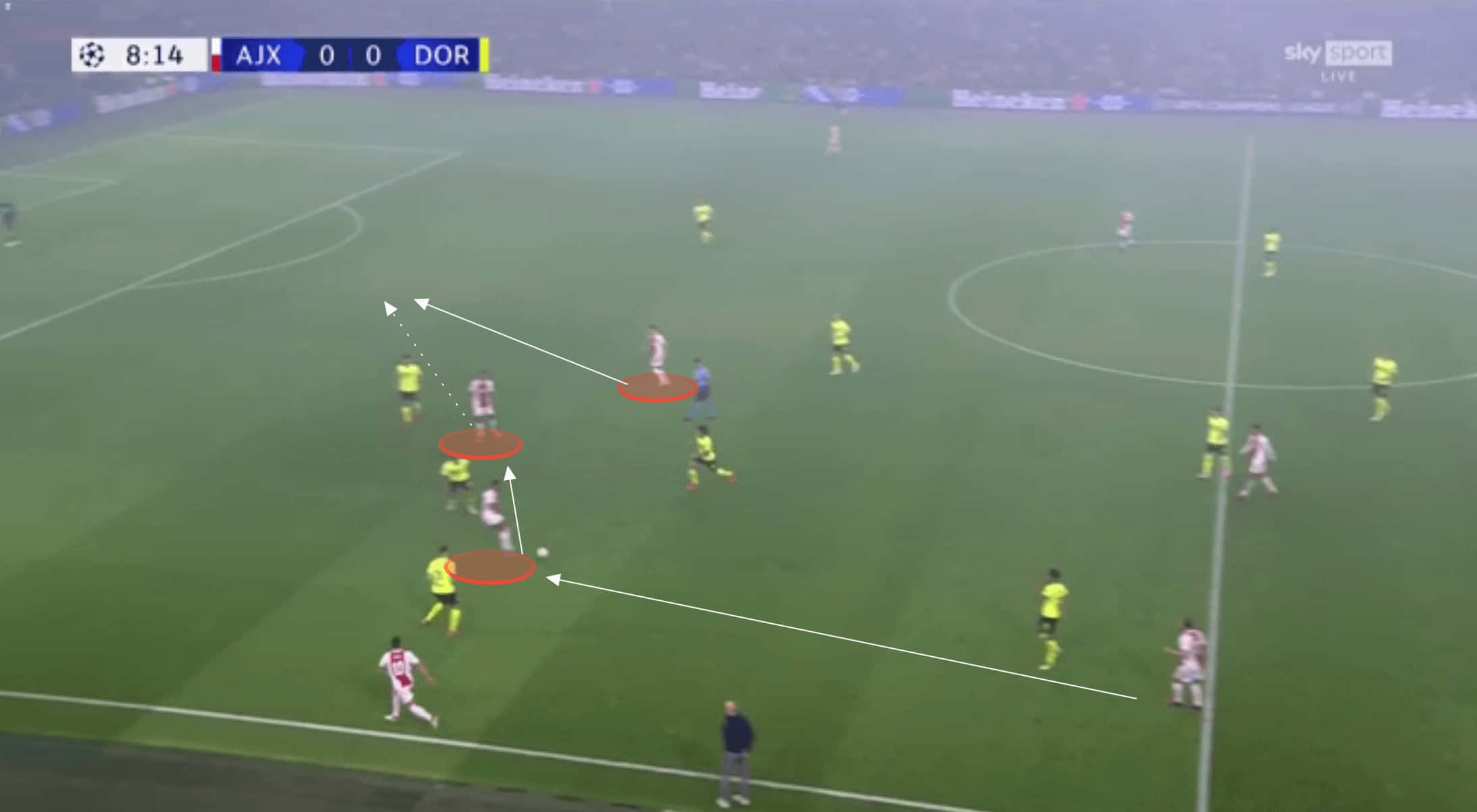Mazraoui then played out wide before under-lapping, isolating Schulz in a 2v1 and allowing Ajax to get the ball behind Dortmund’s defence and get into an advanced attacking position in a matter of seconds.