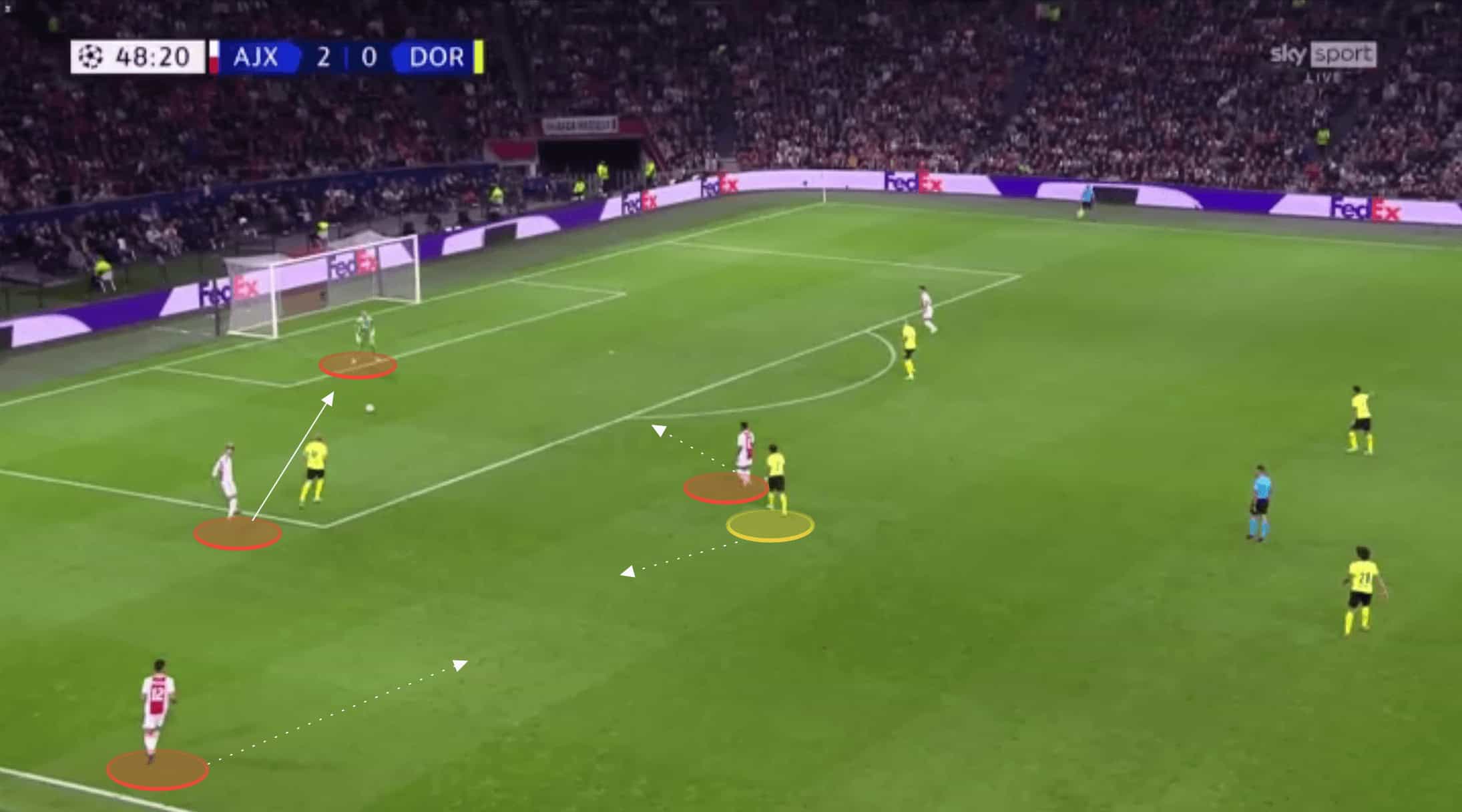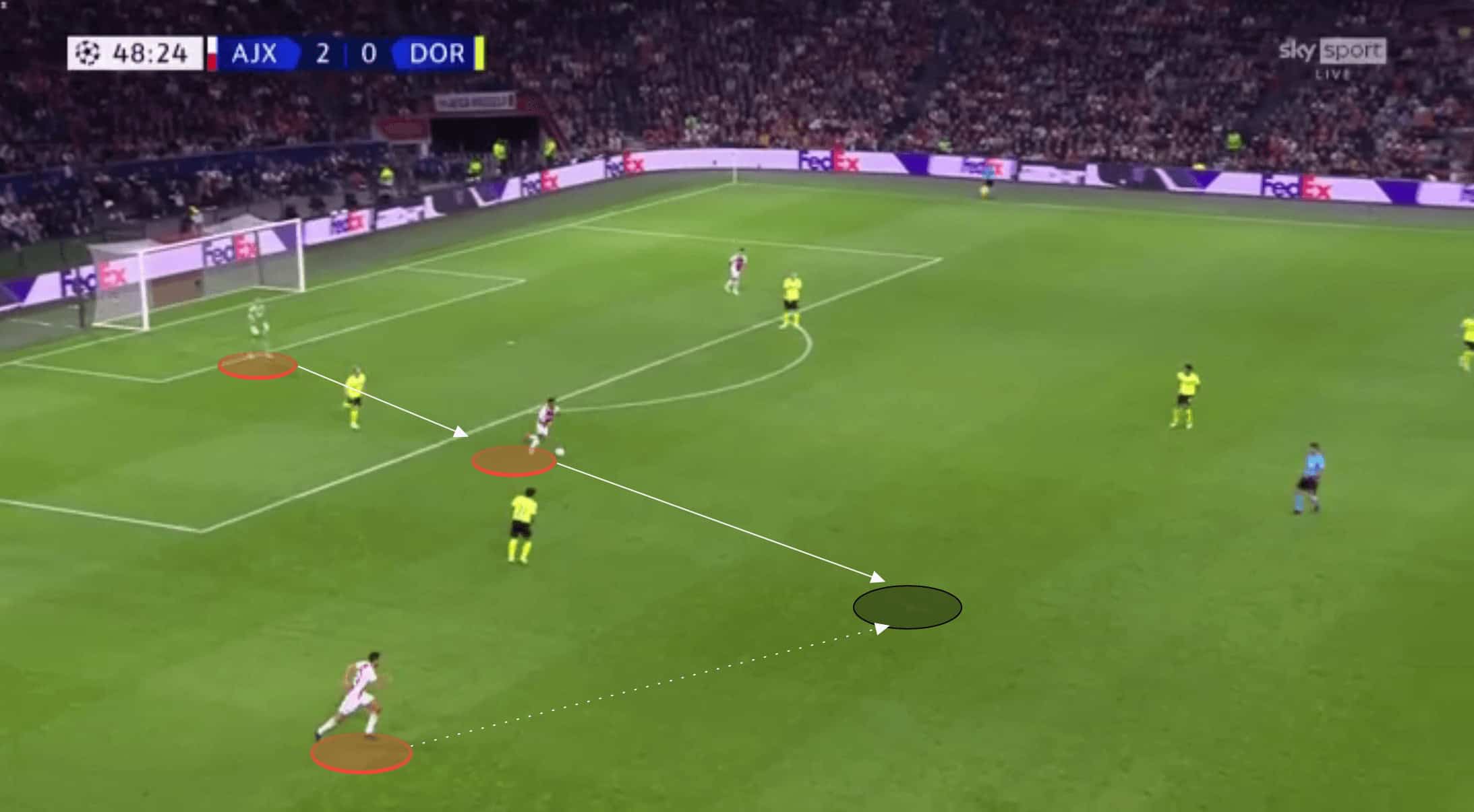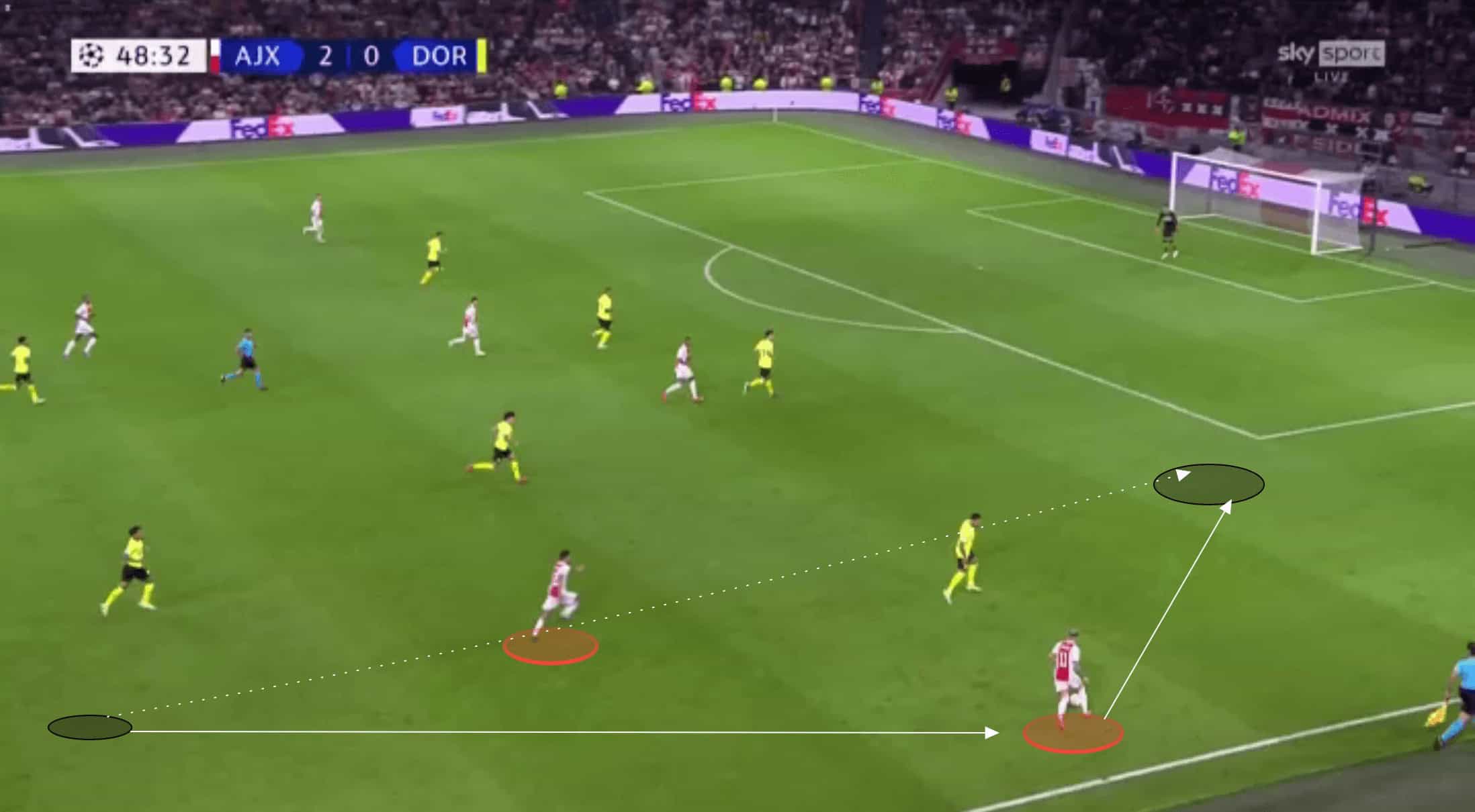 Mazraoui then played out wide before under-lapping, isolating Schulz in a 2v1 and allowing Ajax to get the ball behind Dortmund’s defence and get into an advanced attacking position in a matter of seconds.