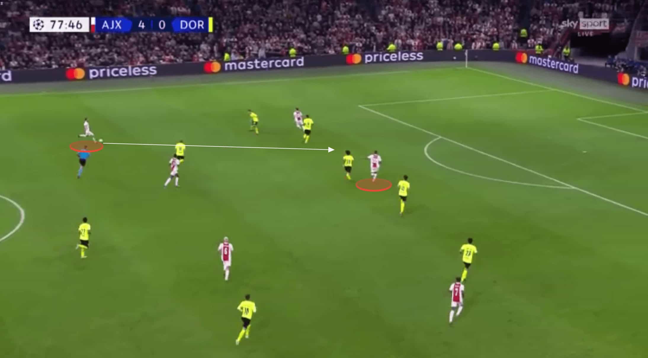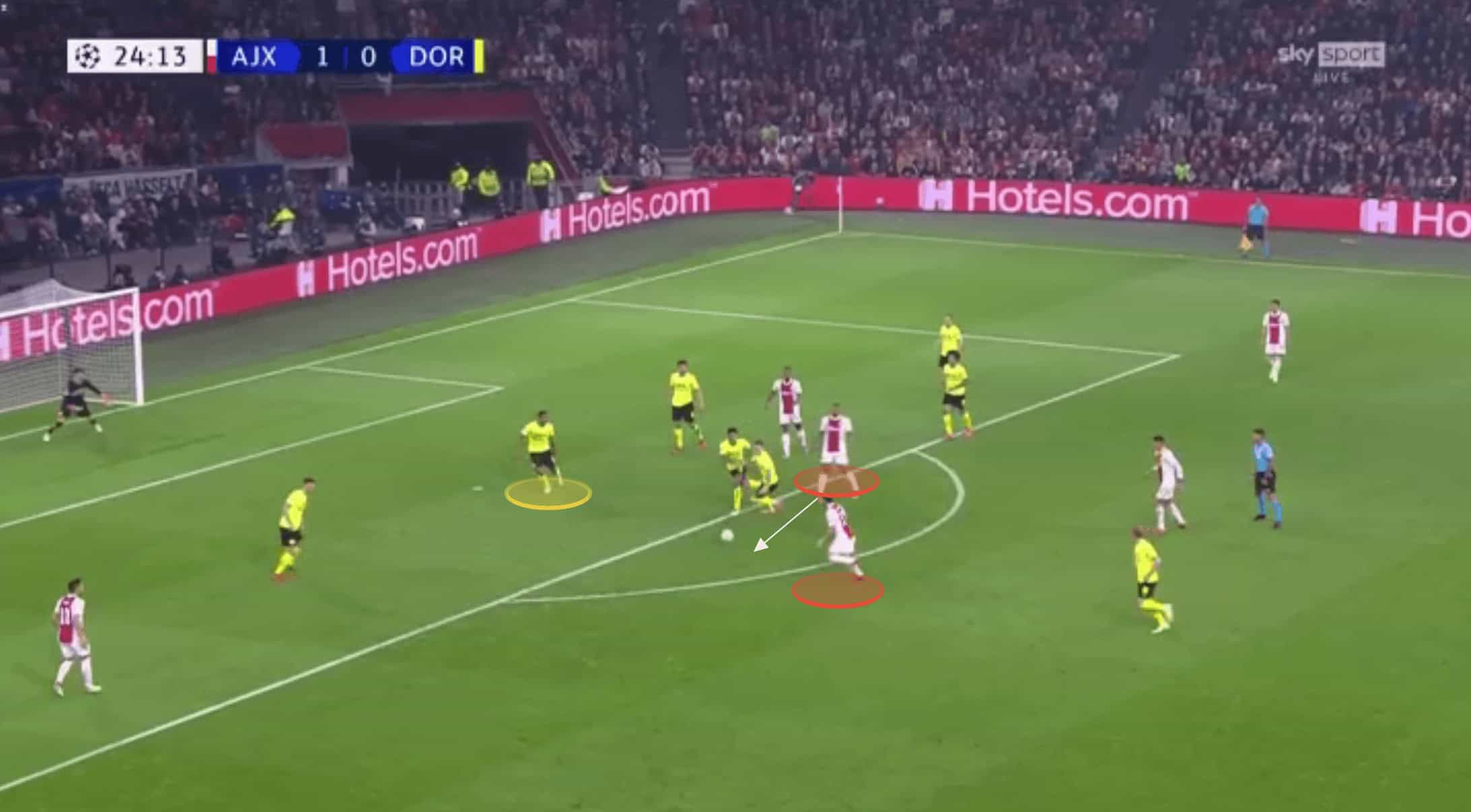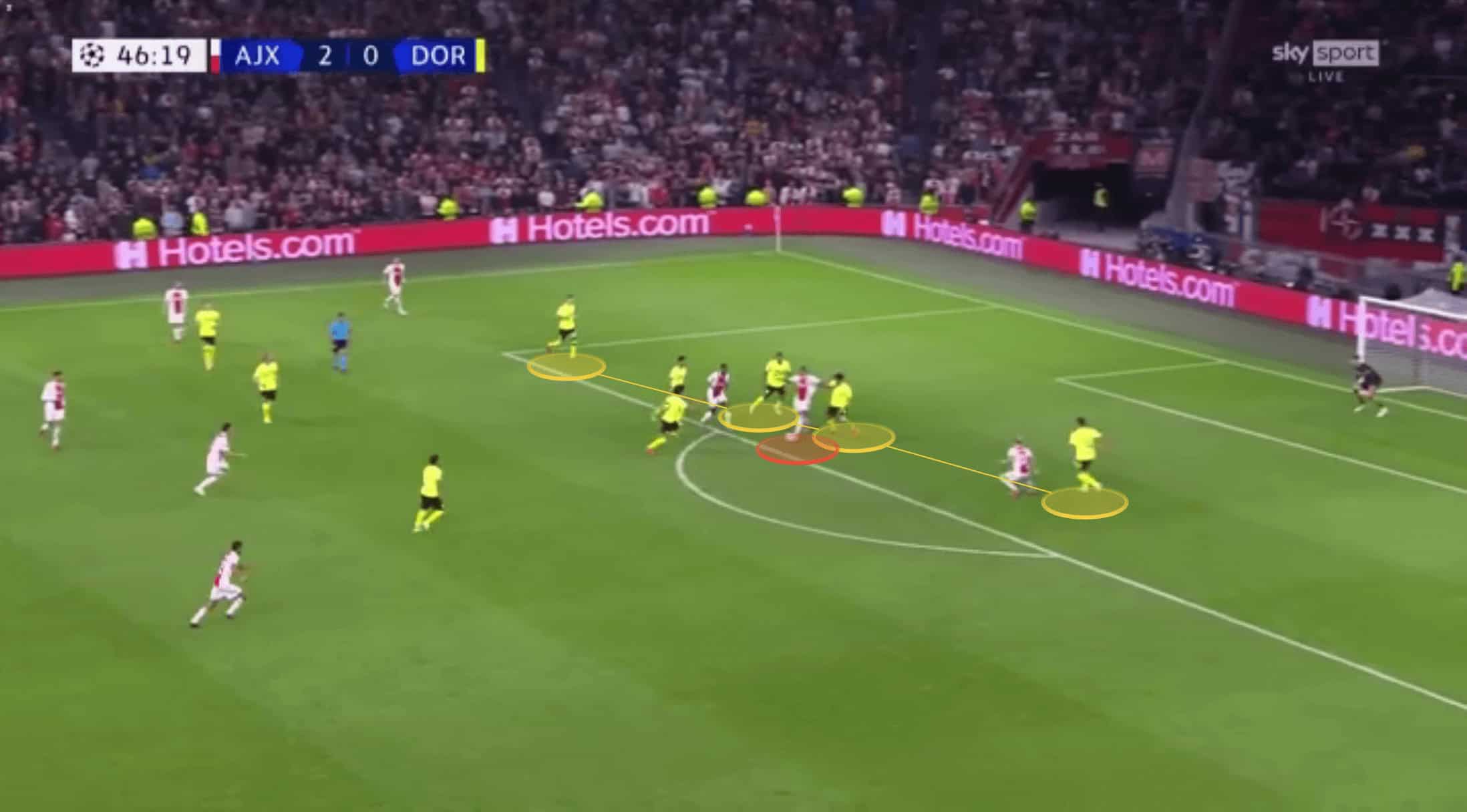 Ajax were able to access this space by repeatedly shifting Dortmund’s defence from one flank to the other. Dortmund would initially start relatively compact, but this high tempo circulation from Ajax meant as the ball was played at wide, as it was in the image below, the home side could drag Schulz out enough to cause this separation between himself and his centre-backs positioned inside from him.