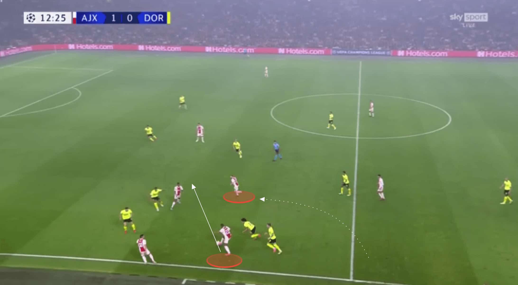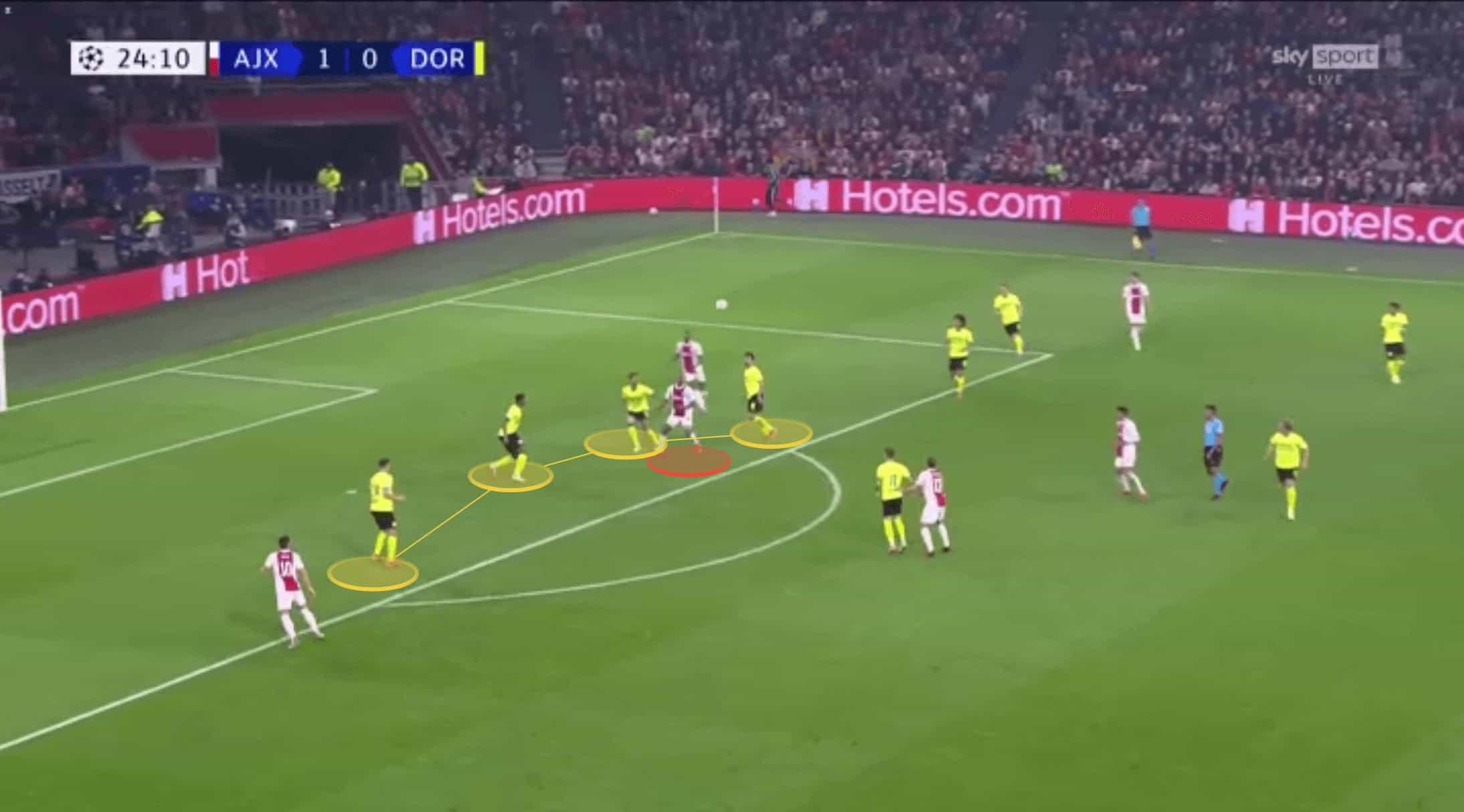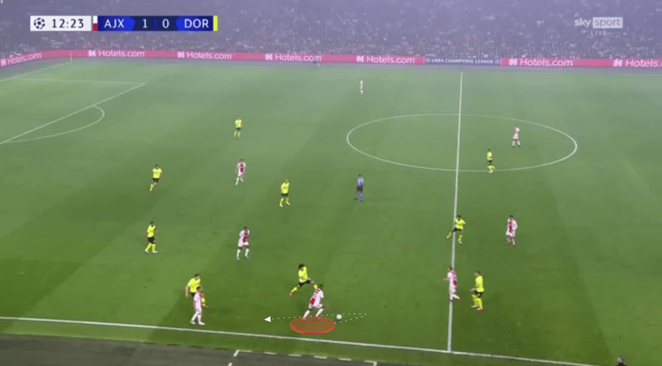 Ajax were able to access this space by repeatedly shifting Dortmund’s defence from one flank to the other. Dortmund would initially start relatively compact, but this high tempo circulation from Ajax meant as the ball was played at wide, as it was in the image below, the home side could drag Schulz out enough to cause this separation between himself and his centre-backs positioned inside from him.