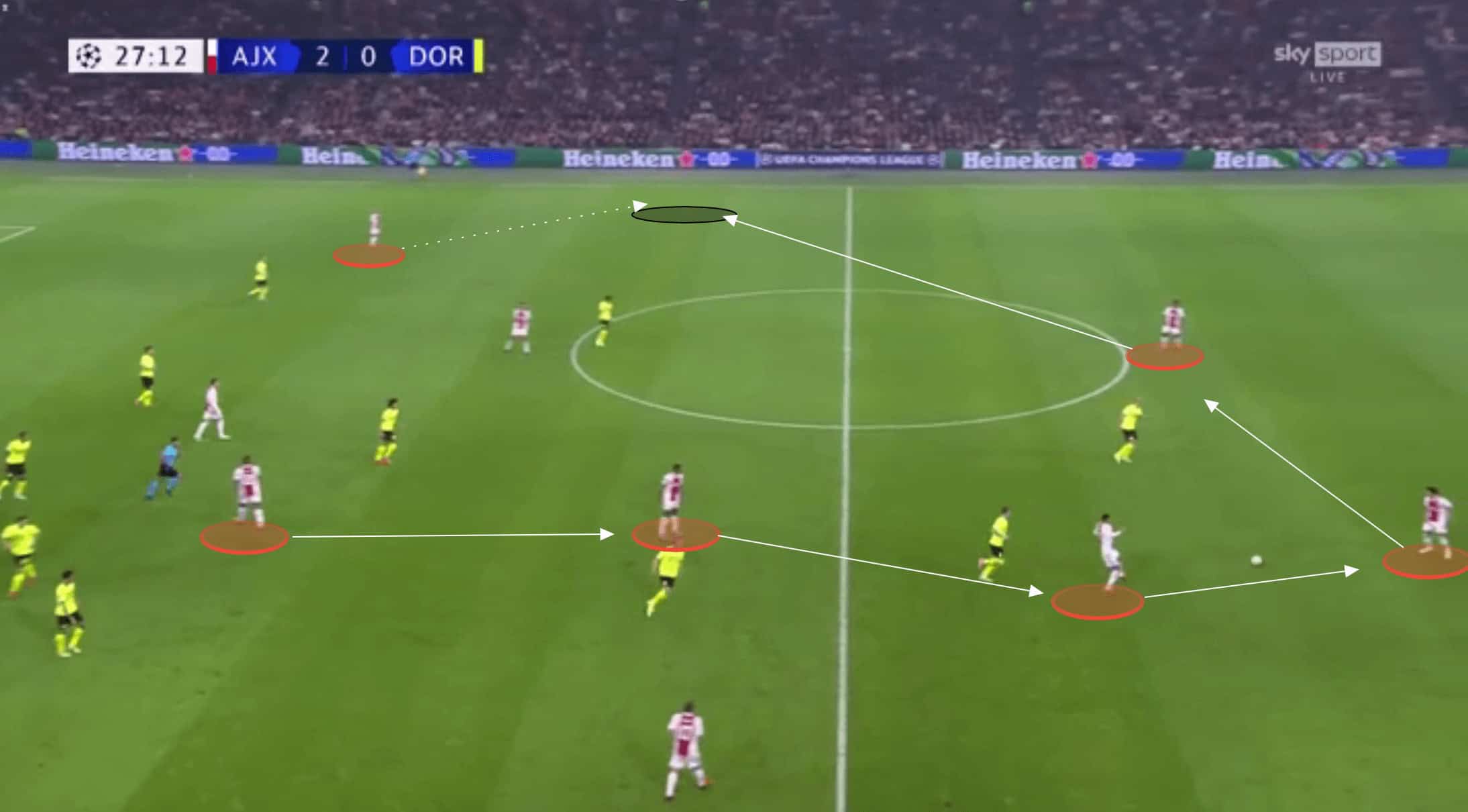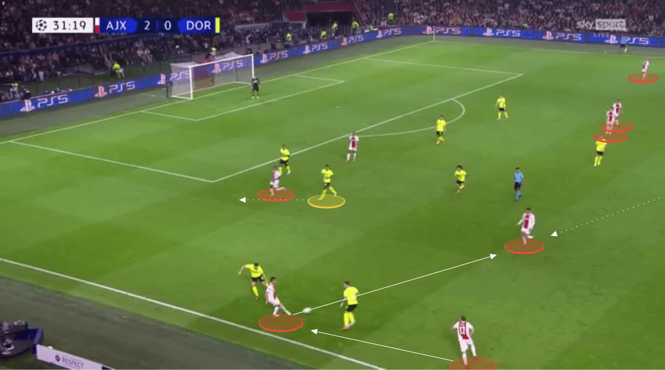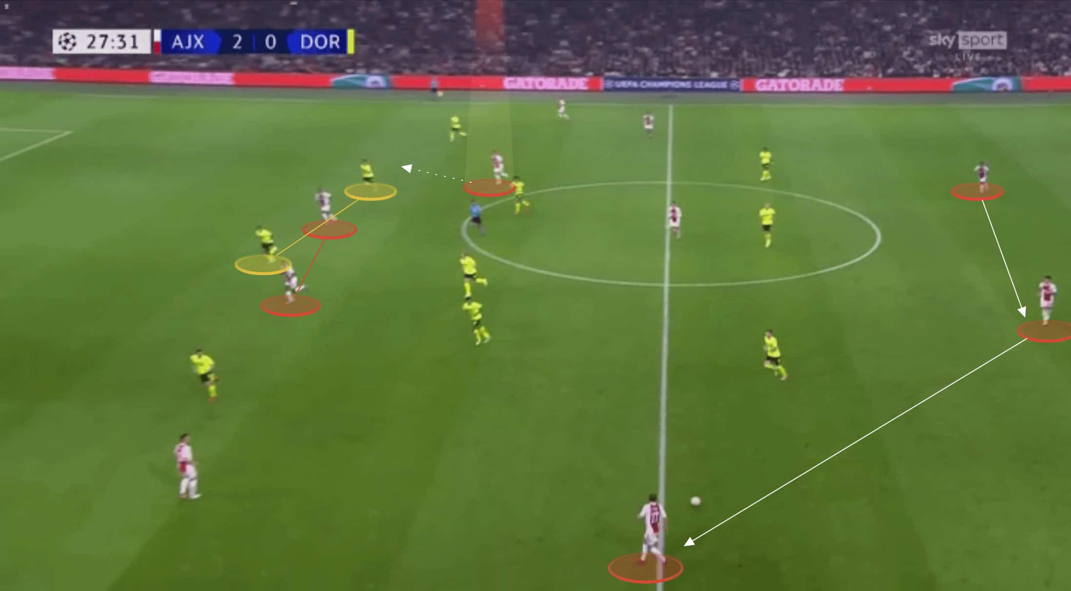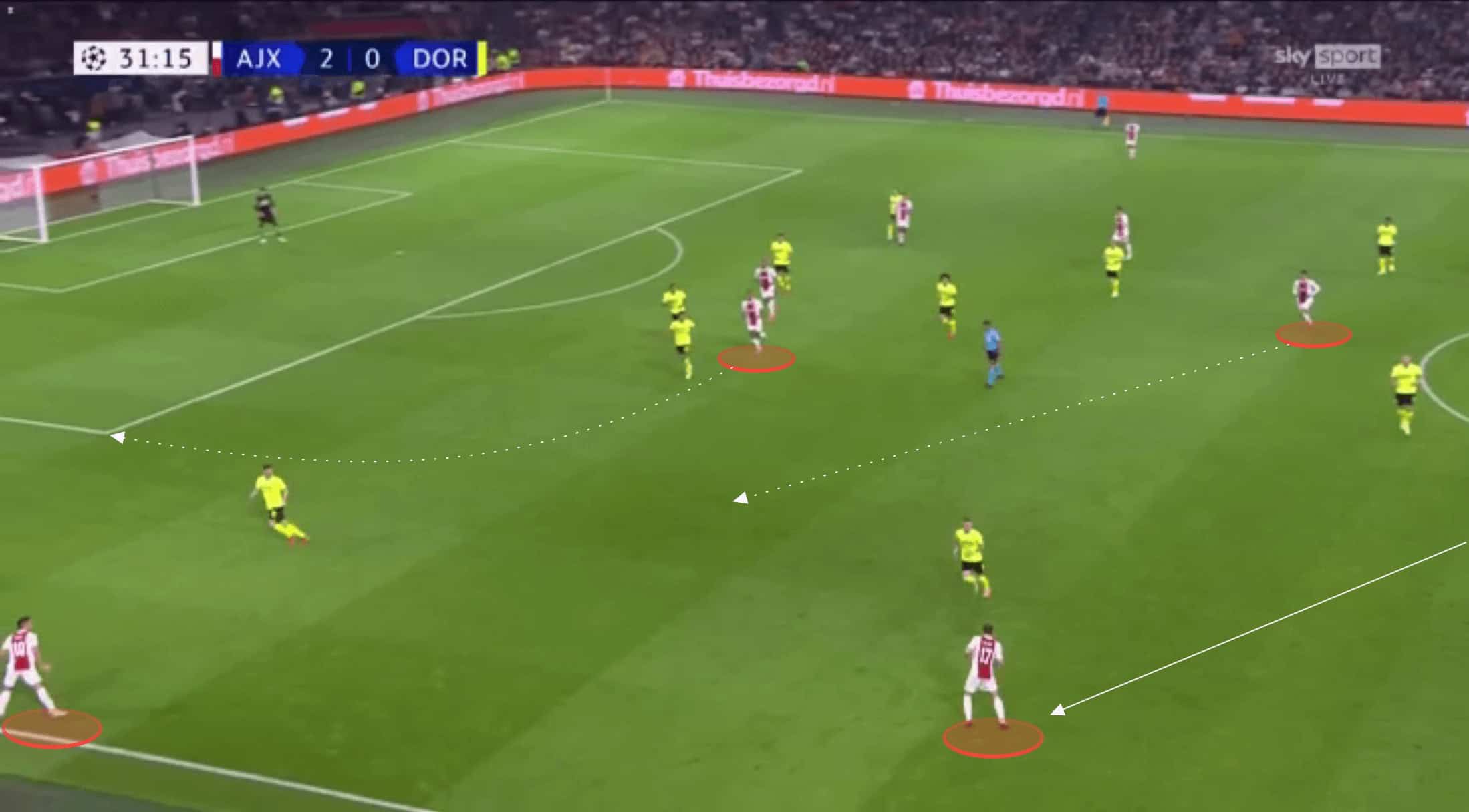 On Tuesday evening in the Champions League, Ajax took on Borussia Dortmund in a group game. At the time of the game, both teams had 100% records having both beaten Besiktas and Sporting. Whilst Ajax enjoyed the home advantage it was surprising to see them come away with such an emphatic win and statement as they put four past Borussia Dortmund, with no reply from the visitors. This tactical analysis will break down the tactics used by Ajax to beat Dortmund so comprehensively on the evening. This analysis will also highlight some of Dortmund’s own failings.