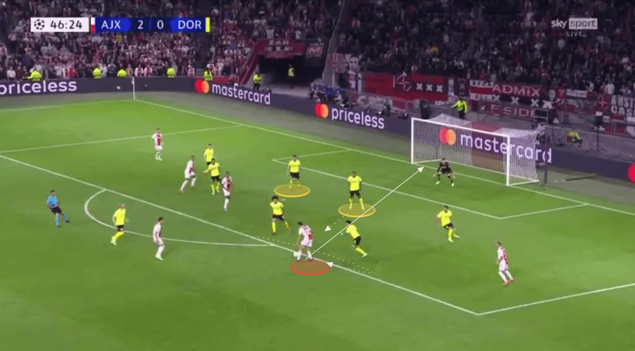 Several of Ajax’s shots on the night came from the Dortmund defence not playing on the front foot and instead gave space for the ball-carrier to get a shot away.