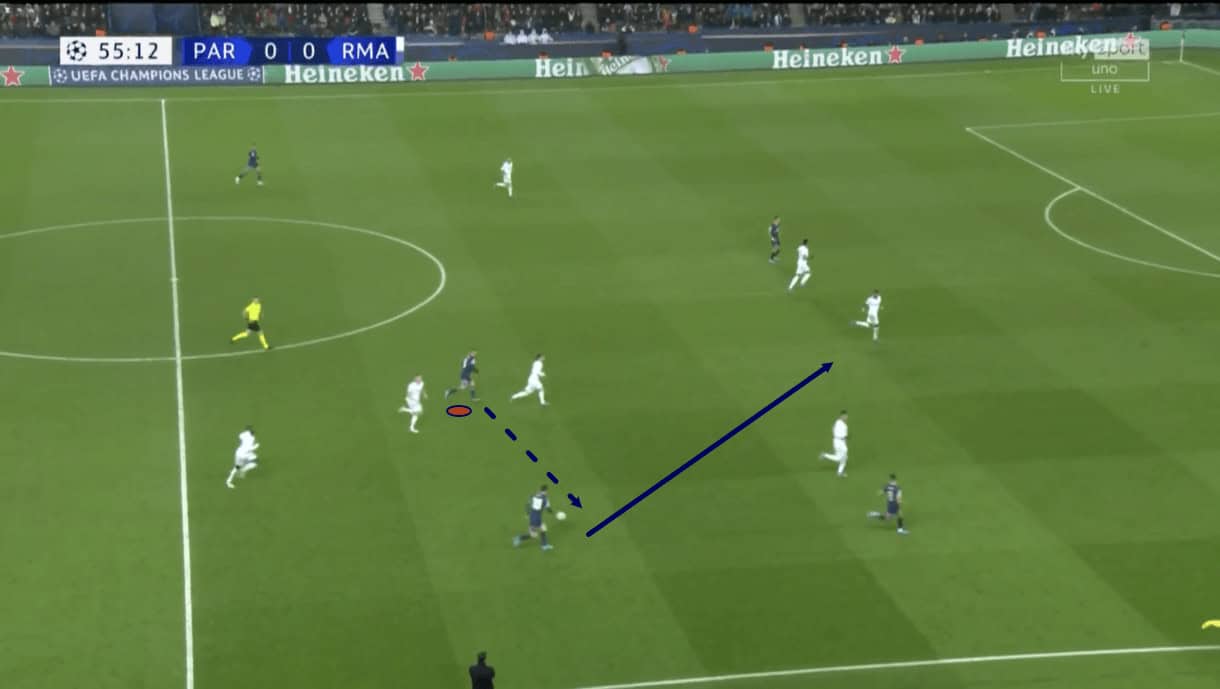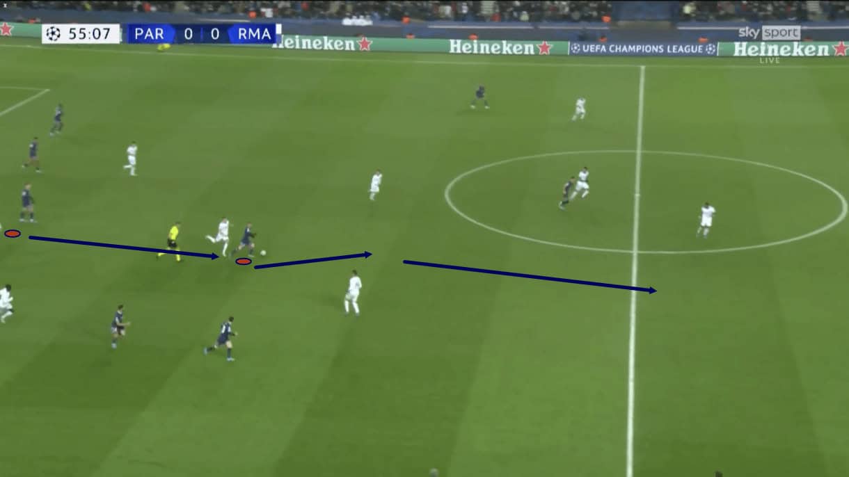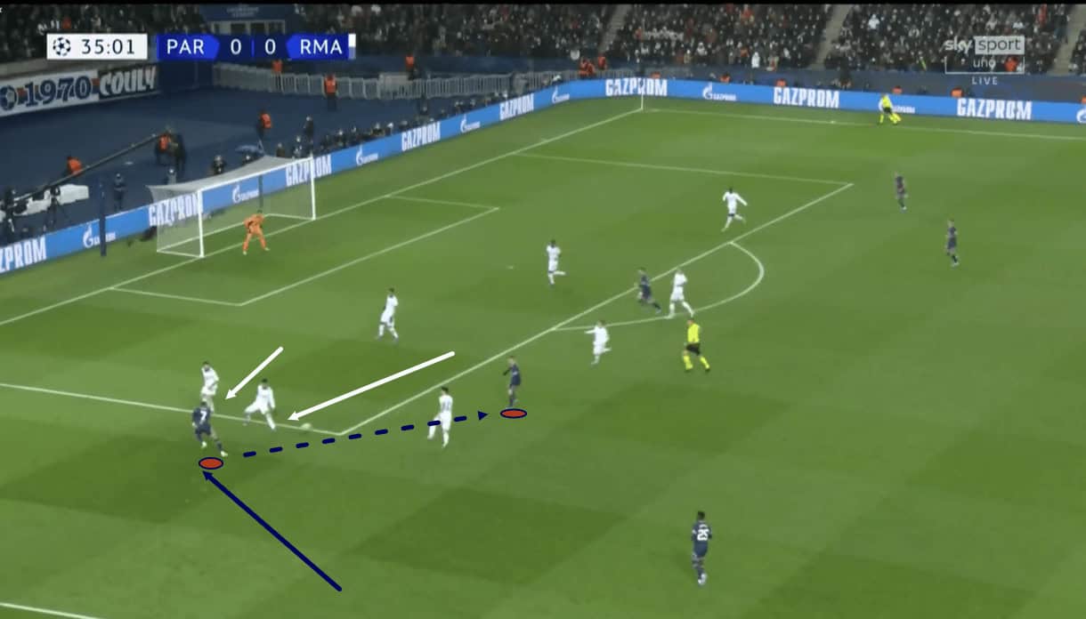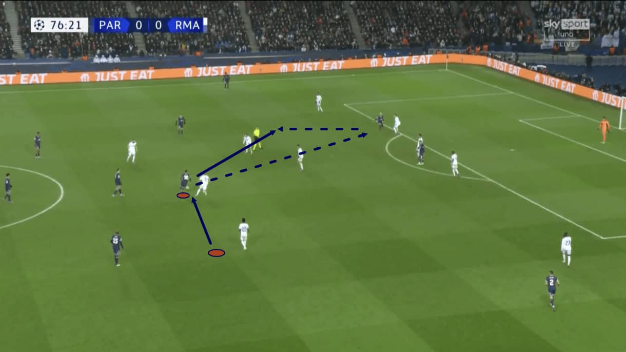 However, in fairness, Real dealt well with the situation by closing down Verratti, as he receives, from multiple angles and knocking the ball out of his control. This kind of situation happened a few times on Tuesday and many of them ended up with the same result — Madrid’s pressure increasing a significant amount as the ball arrives in an advanced central area, where stopping the attack becomes paramount. However, this was an interesting battle between the two sides as Verratti’s press resistance was also on display on several occasions, beating Madrid’s aggressive pressure in the advanced, central areas and finding a way to continue the attack.