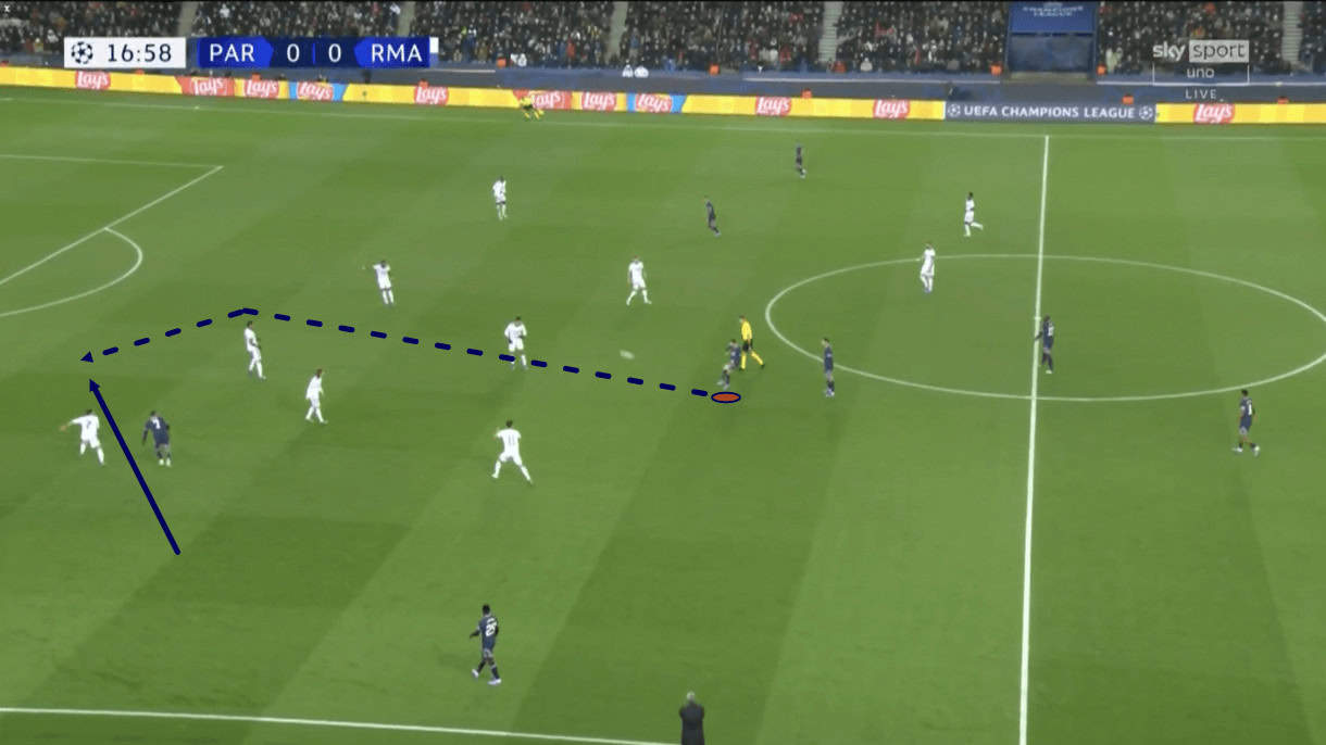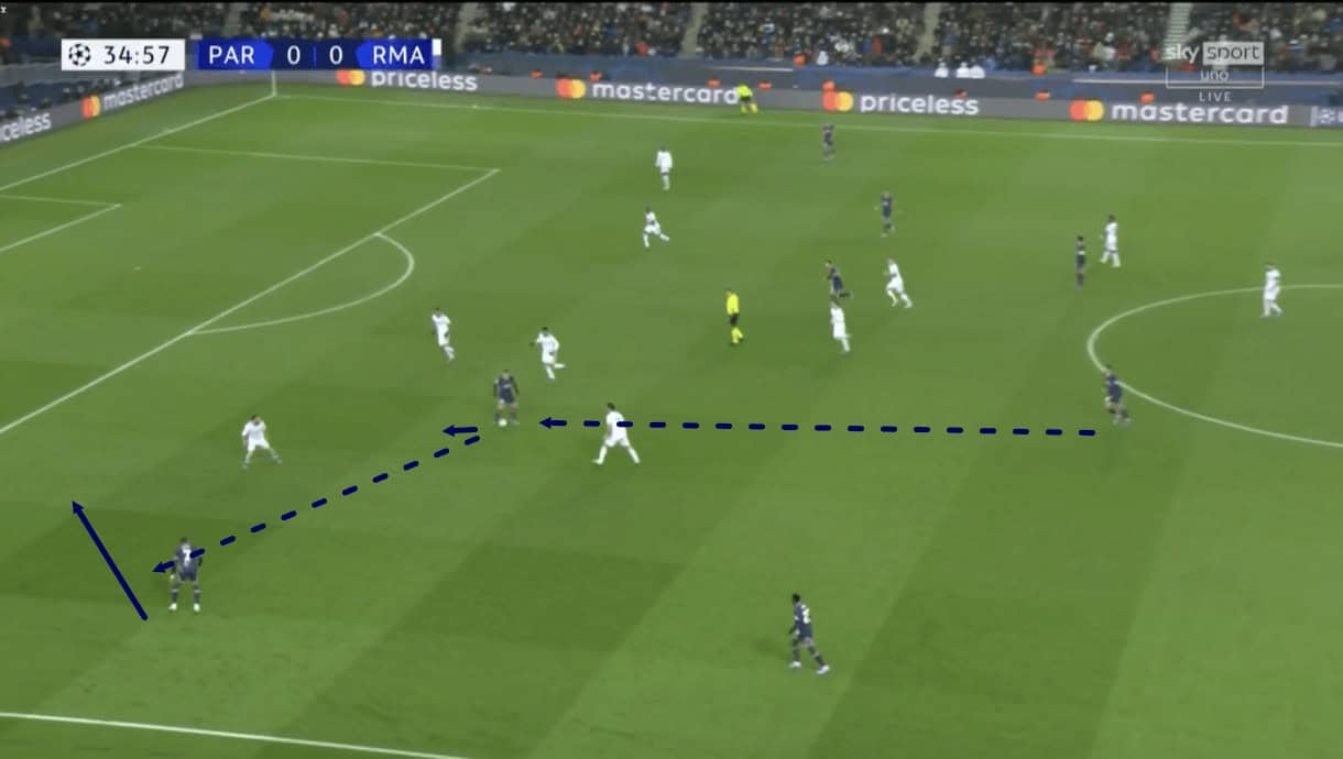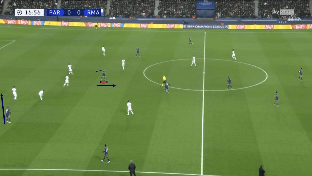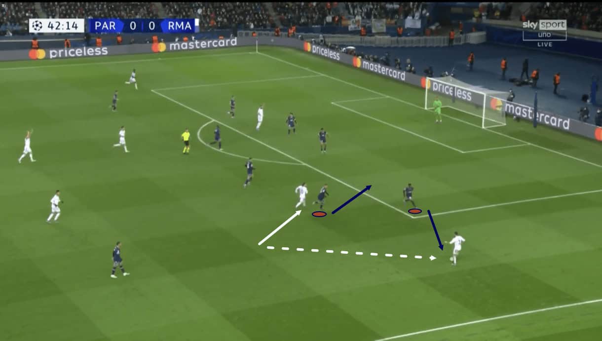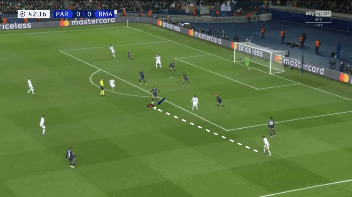 However, in fairness, Real dealt well with the situation by closing down Verratti, as he receives, from multiple angles and knocking the ball out of his control. This kind of situation happened a few times on Tuesday and many of them ended up with the same result — Madrid’s pressure increasing a significant amount as the ball arrives in an advanced central area, where stopping the attack becomes paramount. However, this was an interesting battle between the two sides as Verratti’s press resistance was also on display on several occasions, beating Madrid’s aggressive pressure in the advanced, central areas and finding a way to continue the attack.
